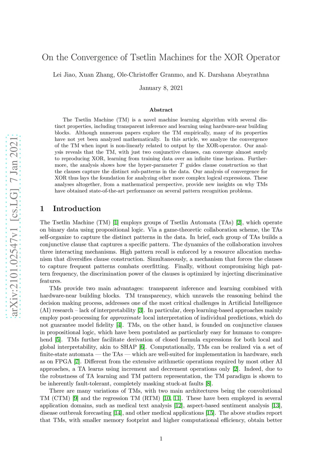 The Tsetlin Machine (TM) is a novel machine learning algorithm with several distinct properties, including transparent inference and learning using hardware-near building blocks. Although numerous papers explore the TM empirically, many of its properties have not yet been analyzed mathematically. In this article, we analyze the convergence of the TM when input is non-linearly related to output by the XOR-operator. Our analysis reveals that the TM, with just two conjunctive clauses, can converge almost surely to reproducing XOR, learning from training data over an infinite time horizon. Furthermore, the analysis shows how the hyper-parameter T guides clause construction so that the clauses capture the distinct sub-patterns in the data. Our analysis of convergence for XOR thus lays the foundation for analyzing other more complex logical expressions. These analyses altogether, from a mathematical perspective, provide new insights on why TMs have obtained state-of-the-art performance on several pattern recognition problems