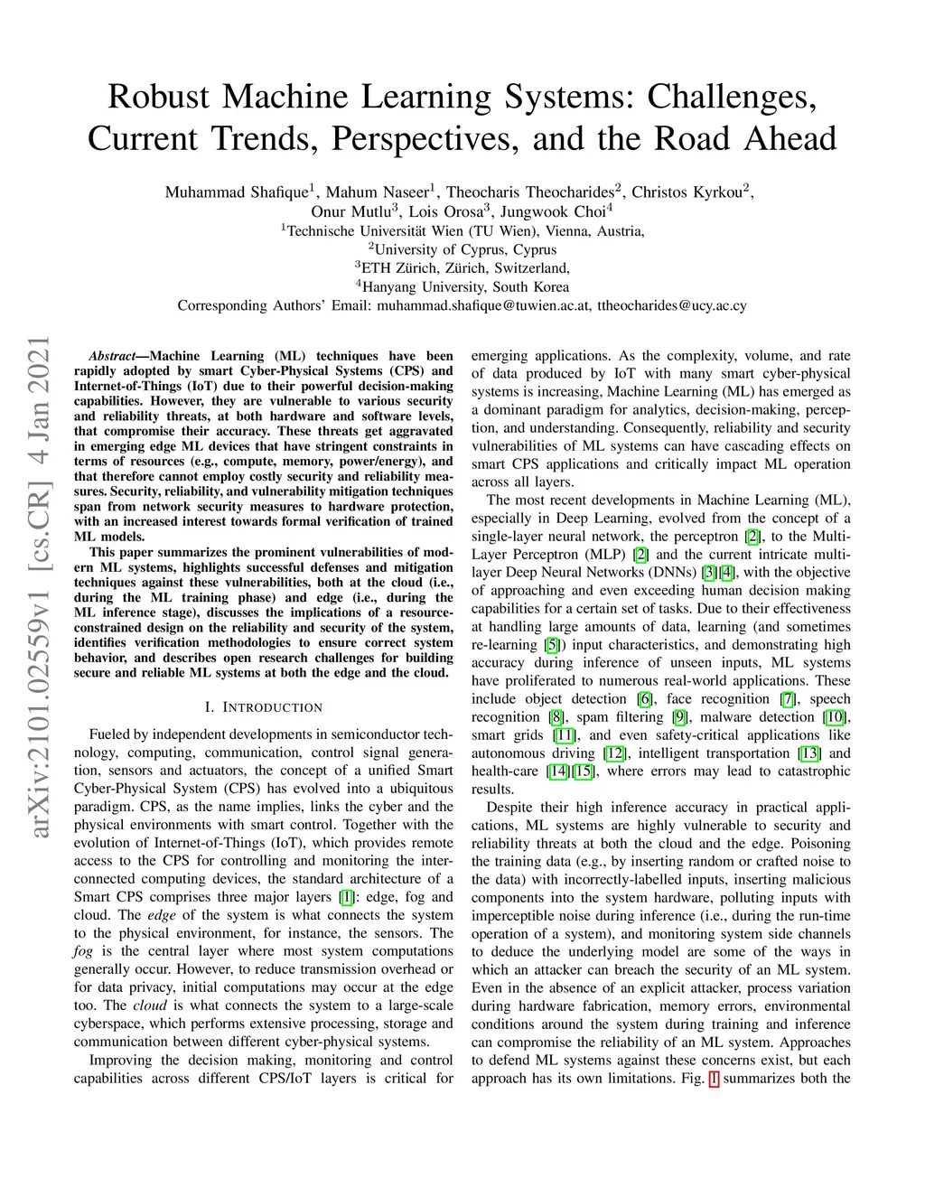 Machine Learning (ML) techniques have been rapidly adopted by smart Cyber-Physical Systems (CPS) and Internet-of-Things (IoT) due to their powerful decision-making capabilities. However, they are vulnerable to various security and reliability threats, at both hardware and software levels, that compromise their accuracy. These threats get aggravated in emerging edge ML devices that have stringent constraints in terms of resources (e.g., compute, memory, power/energy), and that therefore cannot employ costly security and reliability measures. Security, reliability, and vulnerability mitigation techniques span from network security measures to hardware protection, with an increased interest towards formal verification of trained ML models. This paper summarizes the prominent vulnerabilities of modern ML systems, highlights successful defenses and mitigation techniques against these vulnerabilities, both at the cloud (i.e., during the ML training phase) and edge (i.e., during the ML inference stage), discusses the implications of a resource-constrained design on the reliability and security of the system, identifies verification methodologies to ensure correct system behavior, and describes open research challenges for building secure and reliable ML systems at both the edge and the cloud.