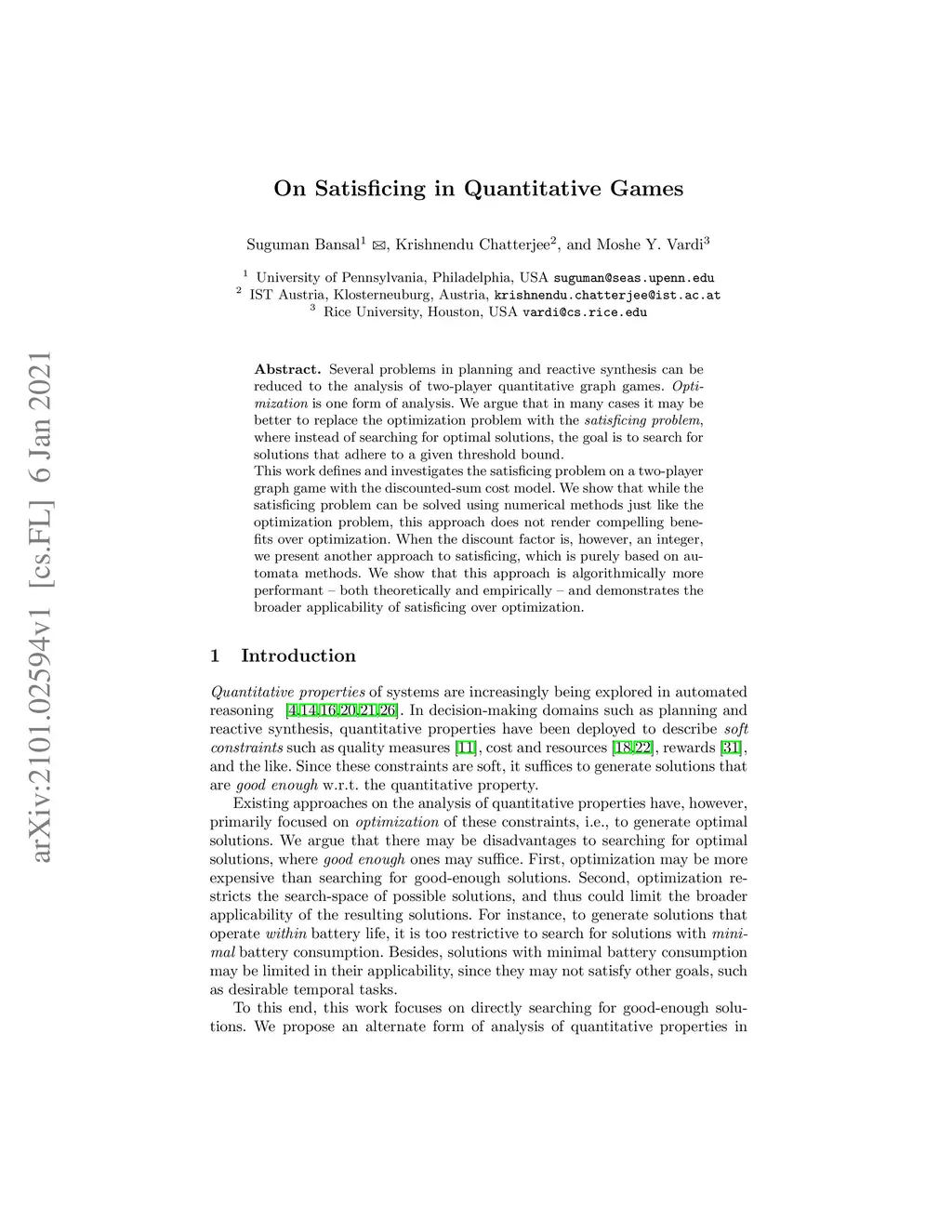 Several problems in planning and reactive synthesis can be reduced to the analysis of two-player quantitative graph games. {\em Optimization} is one form of analysis. We argue that in many cases it may be better to replace the optimization problem with the {\em satisficing problem}, where instead of searching for optimal solutions, the goal is to search for solutions that adhere to a given threshold bound. This work defines and investigates the satisficing problem on a two-player graph game with the discounted-sum cost model. We show that while the satisficing problem can be solved using numerical methods just like the optimization problem, this approach does not render compelling benefits over optimization. When the discount factor is, however, an integer, we present another approach to satisficing, which is purely based on automata methods. We show that this approach is algorithmically more performant -- both theoretically and empirically -- and demonstrates the broader applicability of satisficing overoptimization.