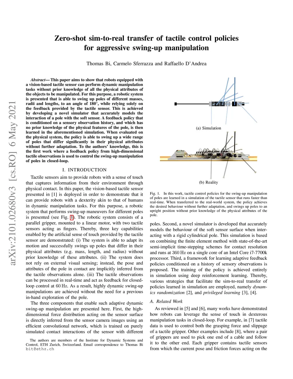 This paper aims to show that robots equipped with a vision-based tactile sensor can perform dynamic manipulation tasks without prior knowledge of all the physical attributes of the objects to be manipulated. For this purpose, a robotic system is presented that is able to swing up poles of different masses, radii and lengths, to an angle of 180 degrees, while relying solely on the feedback provided by the tactile sensor. This is achieved by developing a novel simulator that accurately models the interaction of a pole with the soft sensor. A feedback policy that is conditioned on a sensory observation history, and which has no prior knowledge of the physical features of the pole, is then learned in the aforementioned simulation. When evaluated on the physical system, the policy is able to swing up a wide range of poles that differ significantly in their physical attributes without further adaptation. To the authors' knowledge, this is the first work where a feedback policy from high-dimensional tactile observations is used to control the swing-up manipulation of poles in closed-loop.