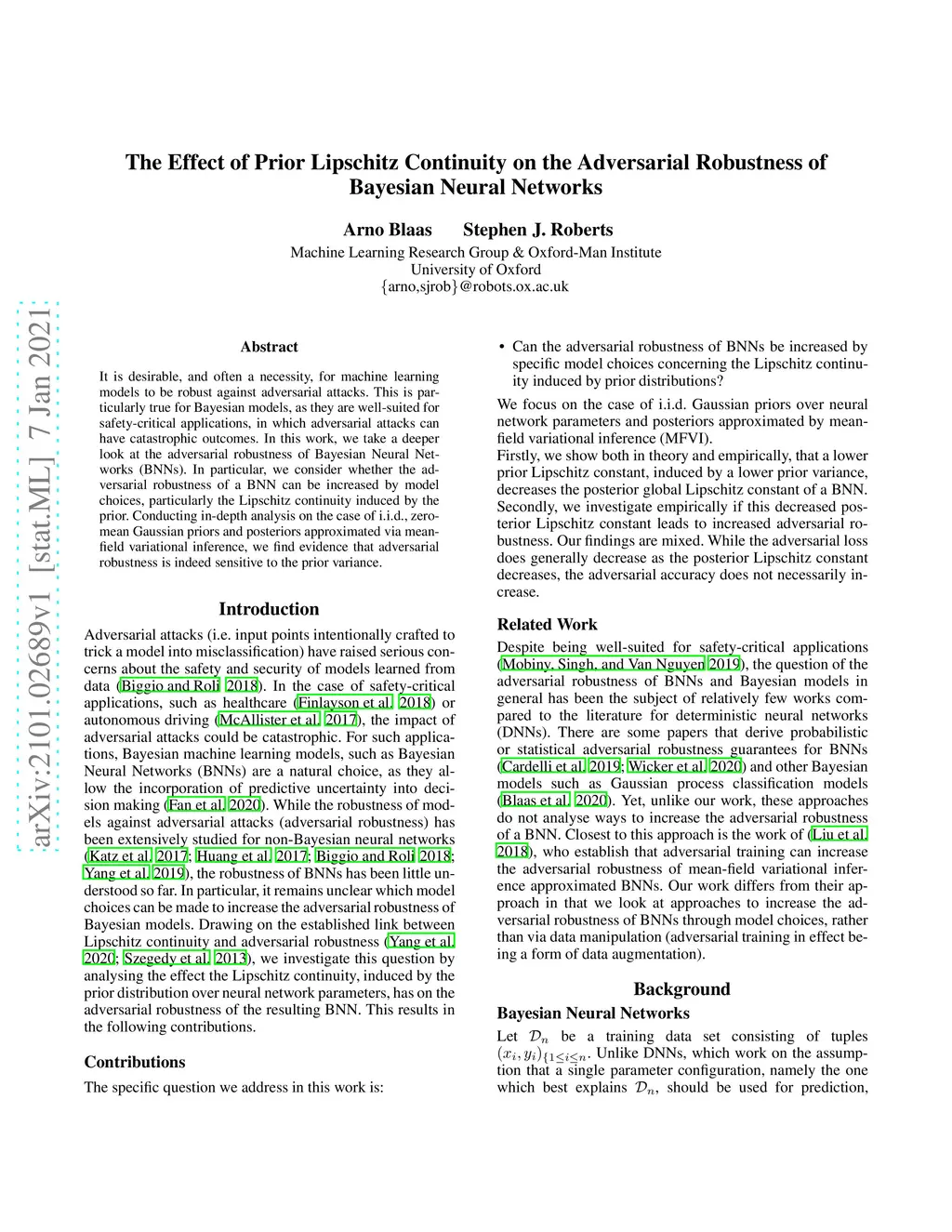 It is desirable, and often a necessity, for machine learning models to be robust against adversarial attacks. This is particularly true for Bayesian models, as they are well-suited for safety-critical applications, in which adversarial attacks can have catastrophic outcomes. In this work, we take a deeper look at the adversarial robustness of Bayesian Neural Networks (BNNs). In particular, we consider whether the adversarial robustness of a BNN can be increased by model choices, particularly the Lipschitz continuity induced by the prior. Conducting in-depth analysis on the case of i.i.d., zero-mean Gaussian priors and posteriors approximated via mean-field variational inference, we find evidence that adversarial robustness is indeed sensitive to the prior variance.