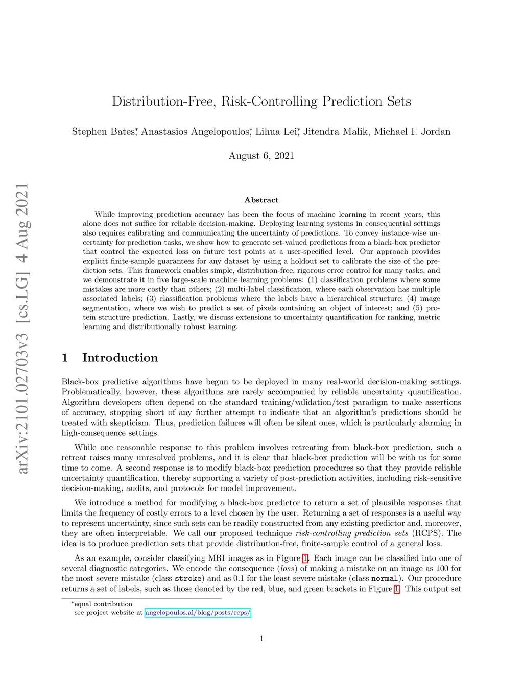 While improving prediction accuracy has been the focus of machine learning in recent years, this alone does not suffice for reliable decision-making. Deploying learning systems in consequential settings also requires calibrating and communicating the uncertainty of predictions. To convey instance-wise uncertainty for prediction tasks, we show how to generate set-valued predictions from a black-box predictor that control the expected loss on future test points at a user-specified level. Our approach provides explicit finite-sample guarantees for any dataset by using a holdout set to calibrate the size of the prediction sets. This framework enables simple, distribution-free, rigorous error control for many tasks, and we demonstrate it in five large-scale machine learning problems: (1) classification problems where some mistakes are more costly than others; (2) multi-label classification, where each observation has multiple associated labels; (3) classification problems where the labels have a hierarchical structure; (4) image segmentation, where we wish to predict a set of pixels containing an object of interest; and (5) protein structure prediction. Lastly, we discuss extensions to uncertainty quantification for ranking, metric learning and distributionally robust learning.