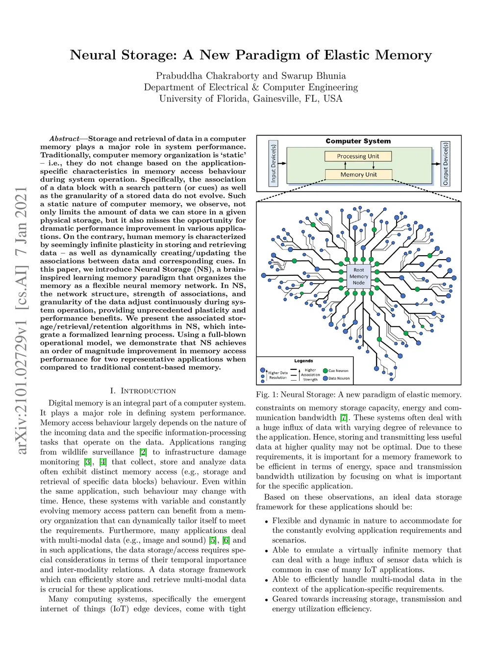 Storage and retrieval of data in a computer memory plays a major role in system performance. Traditionally, computer memory organization is static - i.e., they do not change based on the application-specific characteristics in memory access behaviour during system operation. Specifically, the association of a data block with a search pattern (or cues) as well as the granularity of a stored data do not evolve. Such a static nature of computer memory, we observe, not only limits the amount of data we can store in a given physical storage, but it also misses the opportunity for dramatic performance improvement in various applications. On the contrary, human memory is characterized by seemingly infinite plasticity in storing and retrieving data - as well as dynamically creating/updating the associations between data and corresponding cues. In this paper, we introduce Neural Storage (NS), a brain-inspired learning memory paradigm that organizes the memory as a flexible neural memory network. In NS, the network structure, strength of associations, and granularity of the data adjust continuously during system operation, providing unprecedented plasticity and performance benefits. We present the associated storage/retrieval/retention algorithms in NS, which integrate a formalized learning process. Using a full-blown operational model, we demonstrate that NS achieves an order of magnitude improvement in memory access performance for two representative applications when compared to traditional content-based memory.