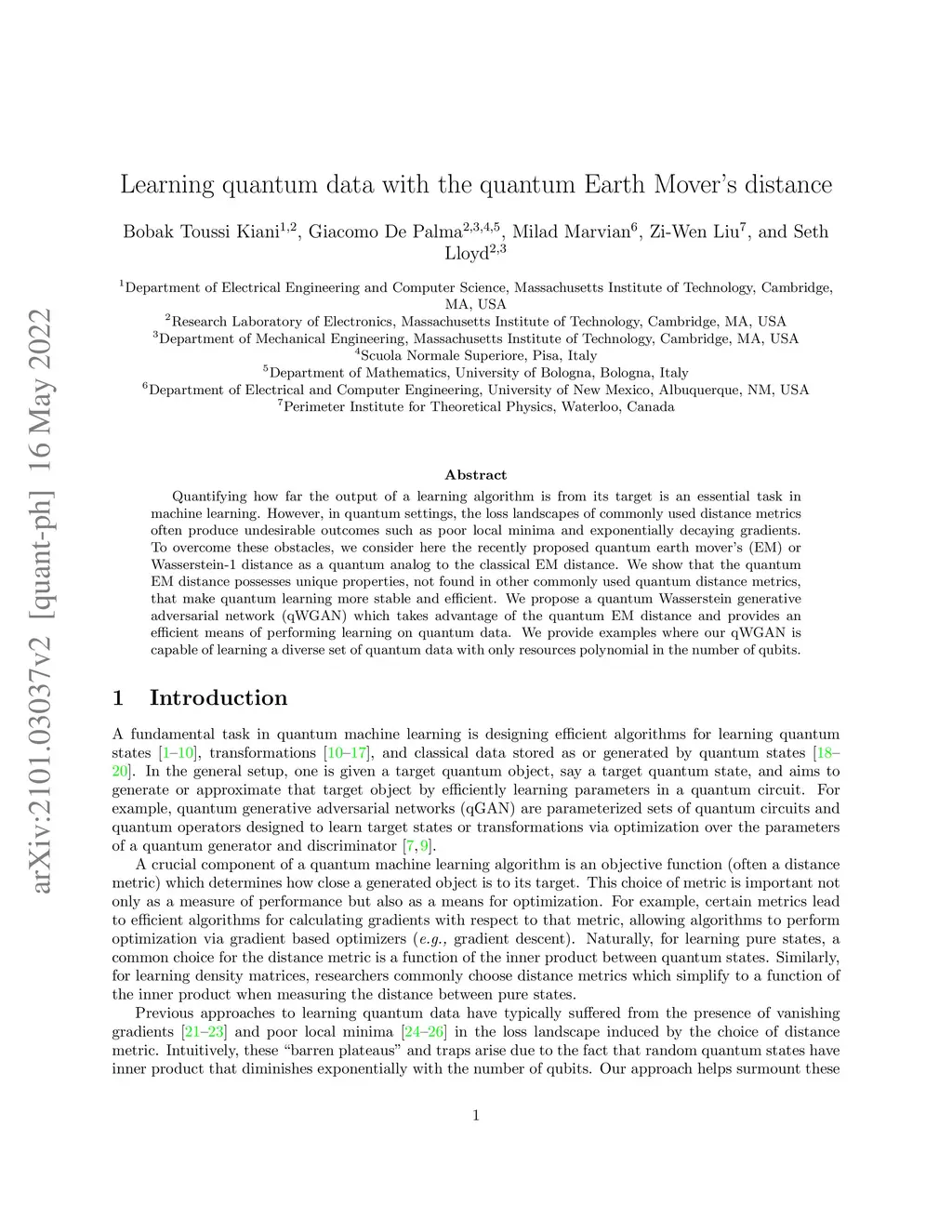 Quantifying how far the output of a learning algorithm is from its target is an essential task in machine learning. However, in quantum settings, the loss landscapes of commonly used distance metrics often produce undesirable outcomes such as poor local minima and exponentially decaying gradients. To overcome these obstacles, we consider here the recently proposed quantum earth mover's (EM) or Wasserstein-1 distance as a quantum analog to the classical EM distance. We show that the quantum EM distance possesses unique properties, not found in other commonly used quantum distance metrics, that make quantum learning more stable and efficient. We propose a quantum Wasserstein generative adversarial network (qWGAN) which takes advantage of the quantum EM distance and provides an efficient means of performing learning on quantum data. We provide examples where our qWGAN is capable of learning a diverse set of quantum data with only resources polynomial in the number of qubits.