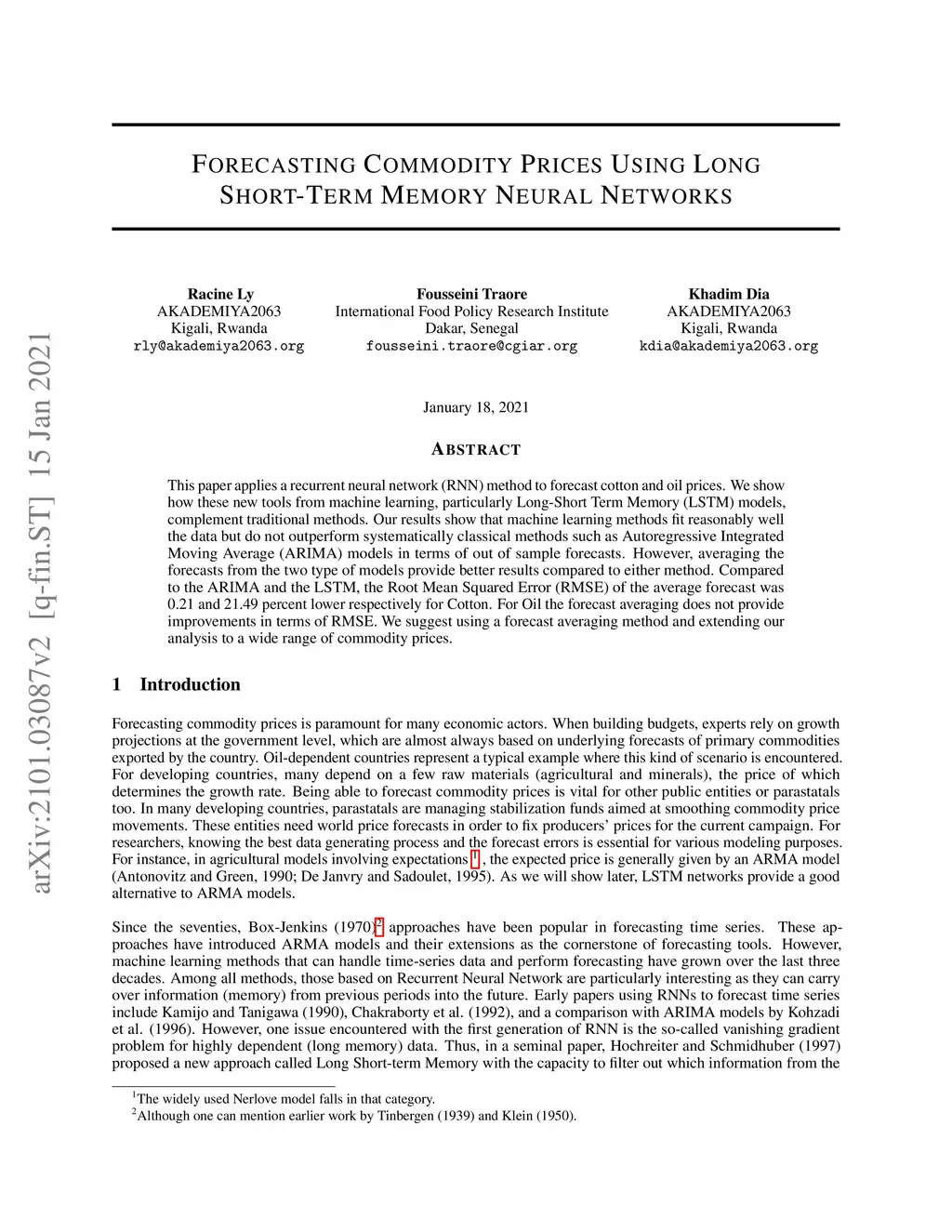 This paper applies a recurrent neural network (RNN) method to forecast cotton and oil prices. We show how these new tools from machine learning, particularly Long-Short Term Memory (LSTM) models, complement traditional methods. Our results show that machine learning methods fit reasonably well the data but do not outperform systematically classical methods such as Autoregressive Integrated Moving Average (ARIMA) models in terms of out of sample forecasts. However, averaging the forecasts from the two type of models provide better results compared to either method. Compared to the ARIMA and the LSTM, the Root Mean Squared Error (RMSE) of the average forecast was 0.21 and 21.49 percent lower respectively for cotton. For oil, the forecast averaging does not provide improvements in terms of RMSE. We suggest using a forecast averaging method and extending our analysis to a wide range of commodity prices.