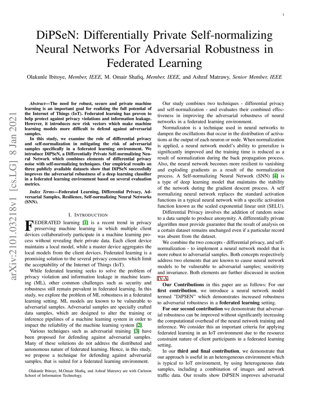 The need for robust, secure and private machine learning is an important goal for realizing the full potential of the Internet of Things (IoT). Federated learning has proven to help protect against privacy violations and information leakage. However, it introduces new risk vectors which make machine learning models more difficult to defend against adversarial samples. In this study, we examine the role of differential privacy and self-normalization in mitigating the risk of adversarial samples specifically in a federated learning environment. We introduce DiPSeN, a Differentially Private Self-normalizing Neural Network which combines elements of differential privacy noise with self-normalizing techniques. Our empirical results on three publicly available datasets show that DiPSeN successfully improves the adversarial robustness of a deep learning classifier in a federated learning environment based on several evaluation metrics.