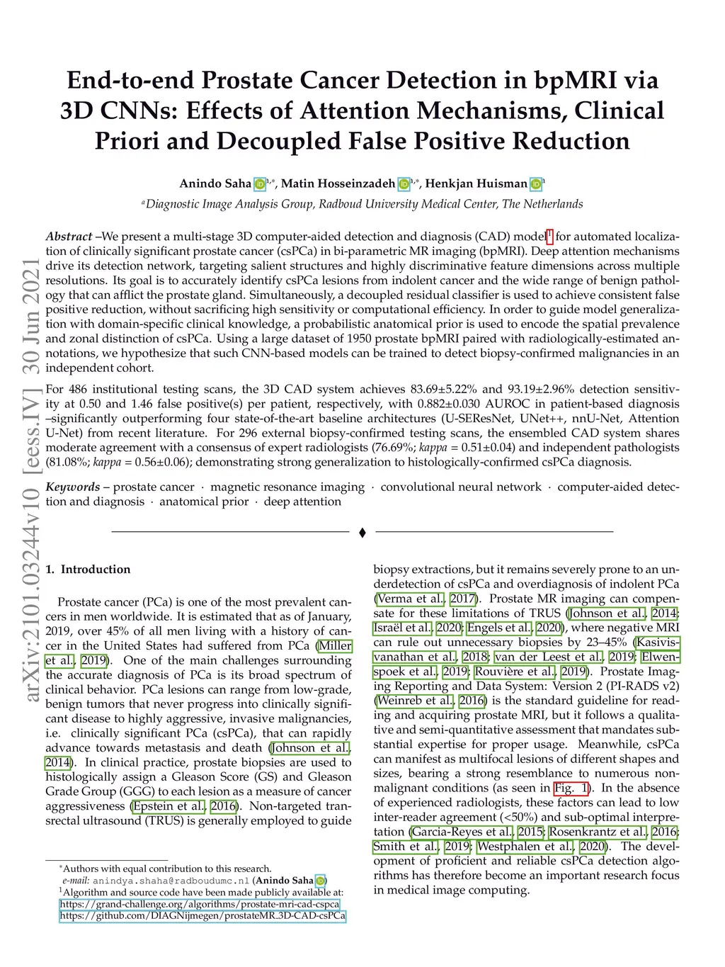We present a multi-stage 3D computer-aided detection and diagnosis (CAD) model for automated localization of clinically significant prostate cancer (csPCa) in bi-parametric MR imaging (bpMRI). Deep attention mechanisms drive its detection network, targeting salient structures and highly discriminative feature dimensions across multiple resolutions. Its goal is to accurately identify csPCa lesions from indolent cancer and the wide range of benign pathology that can afflict the prostate gland. Simultaneously, a decoupled residual classifier is used to achieve consistent false positive reduction, without sacrificing high sensitivity or computational efficiency. In order to guide model generalization with domain-specific clinical knowledge, a probabilistic anatomical prior is used to encode the spatial prevalence and zonal distinction of csPCa. Using a large dataset of 1950 prostate bpMRI paired with radiologically-estimated annotations, we hypothesize that such CNN-based models can be trained to detect biopsy-confirmed malignancies in an independent cohort. For 486 institutional testing scans, the 3D CAD system achieves 83.695.22% and 93.192.96% detection sensitivity at 0.50 and 1.46 false positive(s) per patient, respectively, with 0.8820.030 AUROC in patient-based diagnosis significantly outperforming four state-of-the-art baseline architectures (U-SEResNet, UNet++, nnU-Net, Attention U-Net) from recent literature. For 296 external biopsy-confirmed testing scans, the ensembled CAD system shares moderate agreement with a consensus of expert radiologists (76.69%; 0.510.04) and independent pathologists (81.08%; 0.560.06); demonstrating strong generalization to histologically-confirmed csPCa diagnosis.