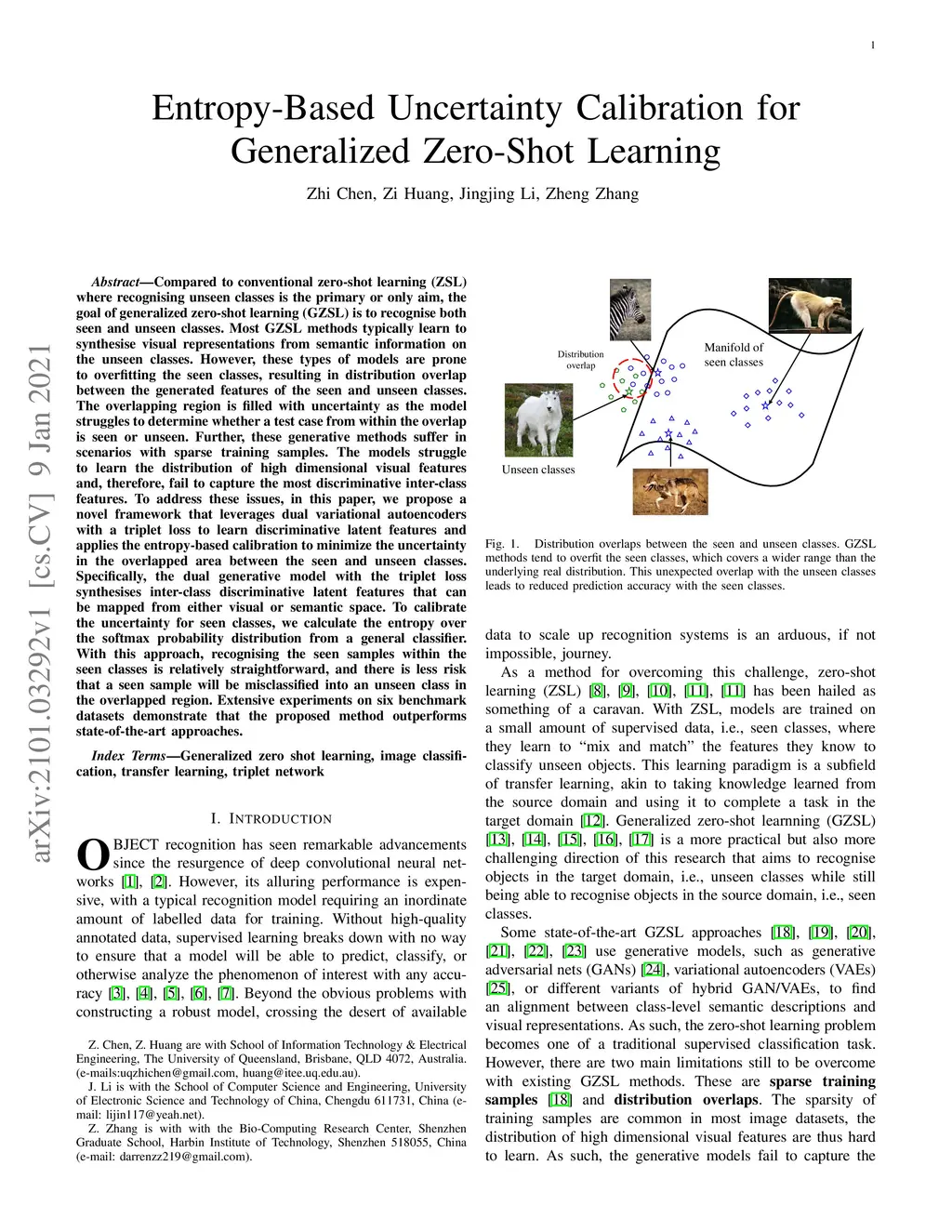 Compared to conventional zero-shot learning (ZSL) where recognising unseen classes is the primary or only aim, the goal of generalized zero-shot learning (GZSL) is to recognise both seen and unseen classes. Most GZSL methods typically learn to synthesise visual representations from semantic information on the unseen classes. However, these types of models are prone to overfitting the seen classes, resulting in distribution overlap between the generated features of the seen and unseen classes. The overlapping region is filled with uncertainty as the model struggles to determine whether a test case from within the overlap is seen or unseen. Further, these generative methods suffer in scenarios with sparse training samples. The models struggle to learn the distribution of high dimensional visual features and, therefore, fail to capture the most discriminative inter-class features. To address these issues, in this paper, we propose a novel framework that leverages dual variational autoencoders with a triplet loss to learn discriminative latent features and applies the entropy-based calibration to minimize the uncertainty in the overlapped area between the seen and unseen classes. Specifically, the dual generative model with the triplet loss synthesises inter-class discriminative latent features that can be mapped from either visual or semantic space. To calibrate the uncertainty for seen classes, we calculate the entropy over the softmax probability distribution from a general classifier. With this approach, recognising the seen samples within the seen classes is relatively straightforward, and there is less risk that a seen sample will be misclassified into an unseen class in the overlapped region. Extensive experiments on six benchmark datasets demonstrate that the proposed method outperforms state-of-the-art approaches.