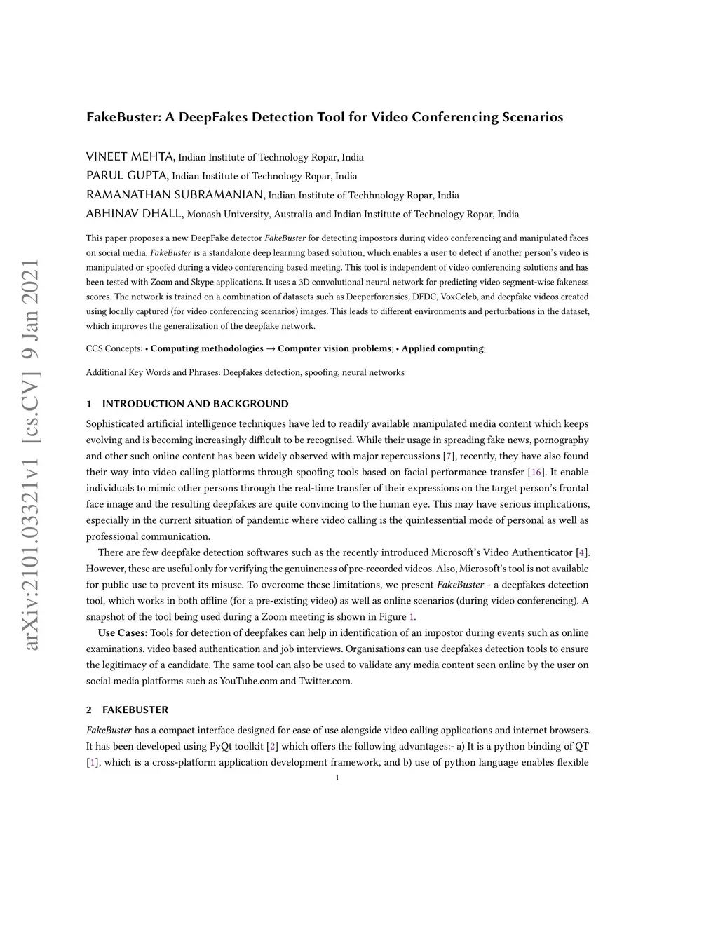 This paper proposes a new DeepFake detector FakeBuster for detecting impostors during video conferencing and manipulated faces on social media. FakeBuster is a standalone deep learning based solution, which enables a user to detect if another person's video is manipulated or spoofed during a video conferencing based meeting. This tool is independent of video conferencing solutions and has been tested with Zoom and Skype applications. It uses a 3D convolutional neural network for predicting video segment-wise fakeness scores. The network is trained on a combination of datasets such as Deeperforensics, DFDC, VoxCeleb, and deepfake videos created using locally captured (for video conferencing scenarios) images. This leads to different environments and perturbations in the dataset, which improves the generalization of the deepfake network.
