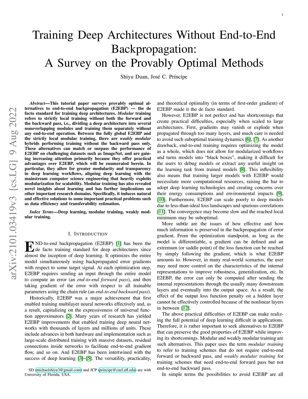 This tutorial paper surveys provably optimal alternatives to end-to-end backpropagation (E2EBP) -- the de facto standard for training deep architectures. Modular training refers to strictly local training without both the forward and the backward pass, i.e., dividing a deep architecture into several nonoverlapping modules and training them separately without any end-to-end operation. Between the fully global E2EBP and the strictly local modular training, there are weakly modular hybrids performing training without the backward pass only. These alternatives can match or surpass the performance of E2EBP on challenging datasets such as ImageNet, and are gaining increasing attention primarily because they offer practical advantages over E2EBP, which will be enumerated herein. In particular, they allow for greater modularity and transparency in deep learning workflows, aligning deep learning with the mainstream computer science engineering that heavily exploits modularization for scalability. Modular training has also revealed novel insights about learning and has further implications on other important research domains. Specifically, it induces natural and effective solutions to some important practical problems such as data efficiency and transferability estimation.