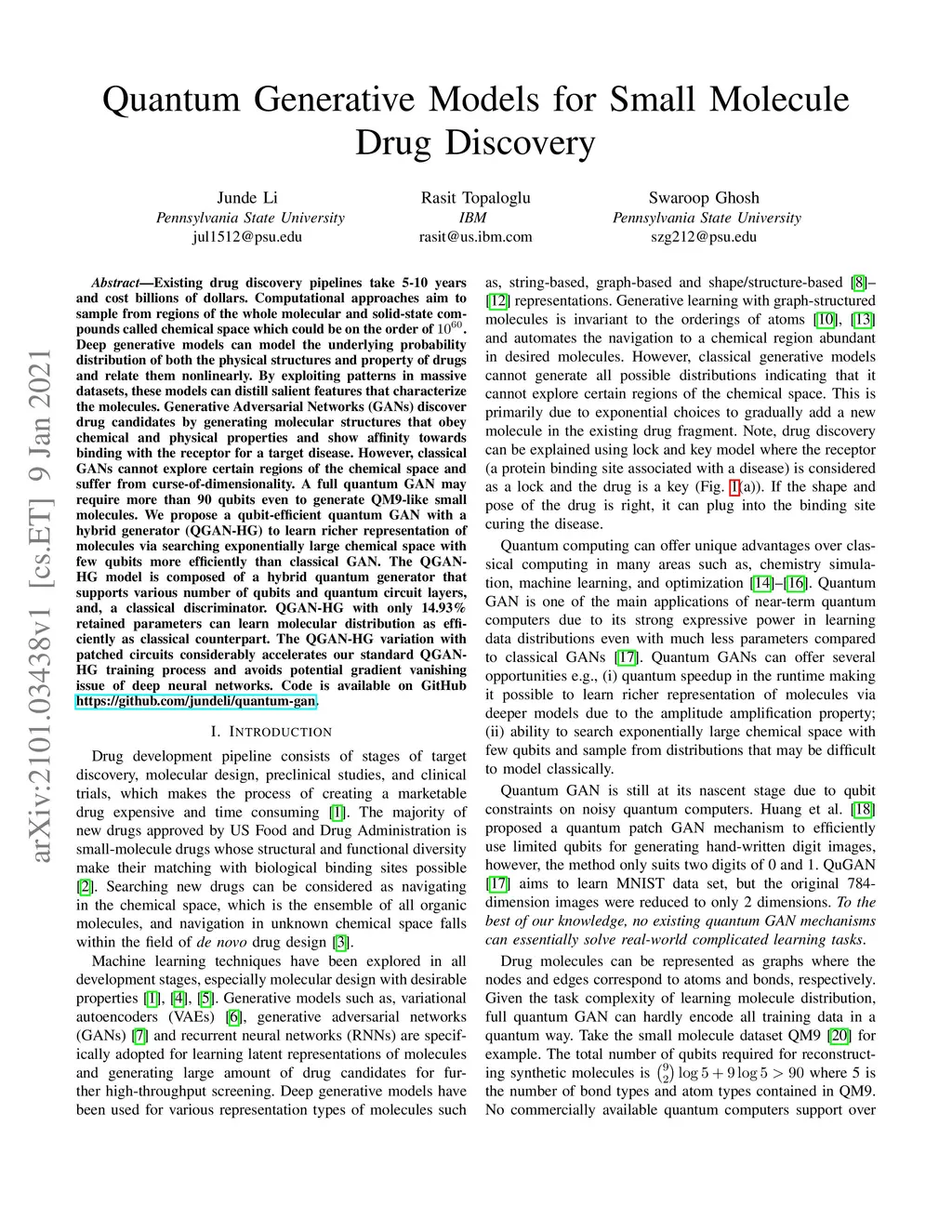 Existing drug discovery pipelines take 5-10 years and cost billions of dollars. Computational approaches aim to sample from regions of the whole molecular and solid-state compounds called chemical space which could be on the order of 1060 . Deep generative models can model the underlying probability distribution of both the physical structures and property of drugs and relate them nonlinearly. By exploiting patterns in massive datasets, these models can distill salient features that characterize the molecules. Generative Adversarial Networks (GANs) discover drug candidates by generating molecular structures that obey chemical and physical properties and show affinity towards binding with the receptor for a target disease. However, classical GANs cannot explore certain regions of the chemical space and suffer from curse-of-dimensionality. A full quantum GAN may require more than 90 qubits even to generate QM9-like small molecules. We propose a qubit-efficient quantum GAN with a hybrid generator (QGAN-HG) to learn richer representation of molecules via searching exponentially large chemical space with few qubits more efficiently than classical GAN. The QGANHG model is composed of a hybrid quantum generator that supports various number of qubits and quantum circuit layers, and, a classical discriminator. QGAN-HG with only 14.93% retained parameters can learn molecular distribution as efficiently as classical counterpart. The QGAN-HG variation with patched circuits considerably accelerates our standard QGANHG training process and avoids potential gradient vanishing issue of deep neural networks. Code is available on GitHub https://github.com/jundeli/quantum-gan.