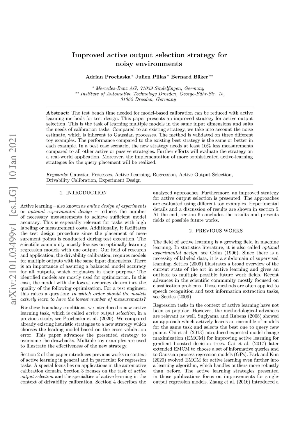 The test bench time needed for model-based calibration can be reduced with active learning methods for test design. This paper presents an improved strategy for active output selection. This is the task of learning multiple models in the same input dimensions and suits the needs of calibration tasks. Compared to an existing strategy, we take into account the noise estimate, which is inherent to Gaussian processes. The method is validated on three different toy examples. The performance compared to the existing best strategy is the same or better in each example. In a best case scenario, the new strategy needs at least 10% less measurements compared to all other active or passive strategies. Further efforts will evaluate the strategy on a real-world application. Moreover, the implementation of more sophisticated active-learning strategies for the query placement will be realized.