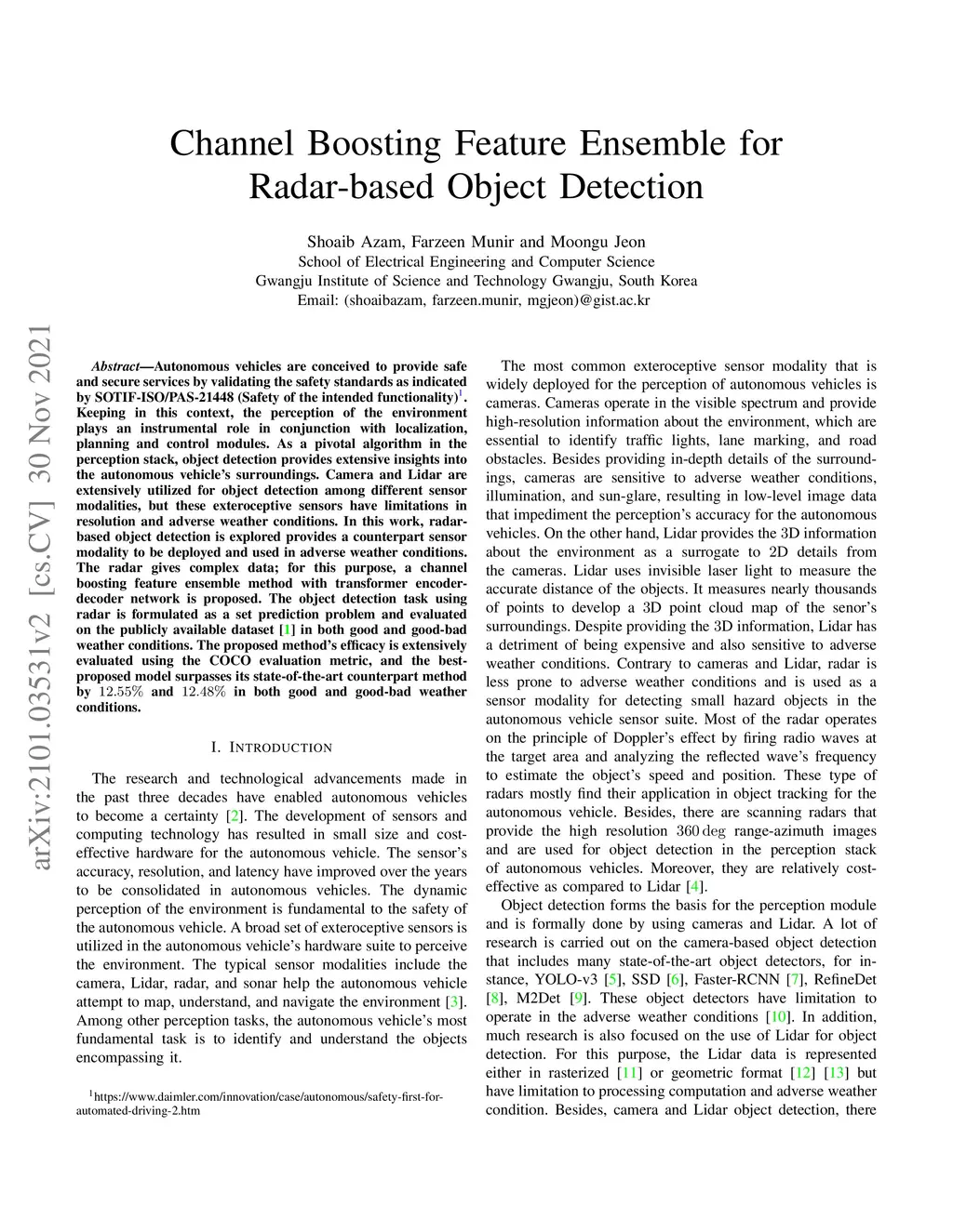 Channel Boosting Feature Ensemble for Radar-based Object Detection