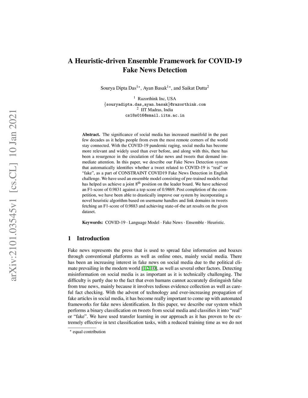 A Heuristic-driven Ensemble Framework for COVID-19 Fake News Detection