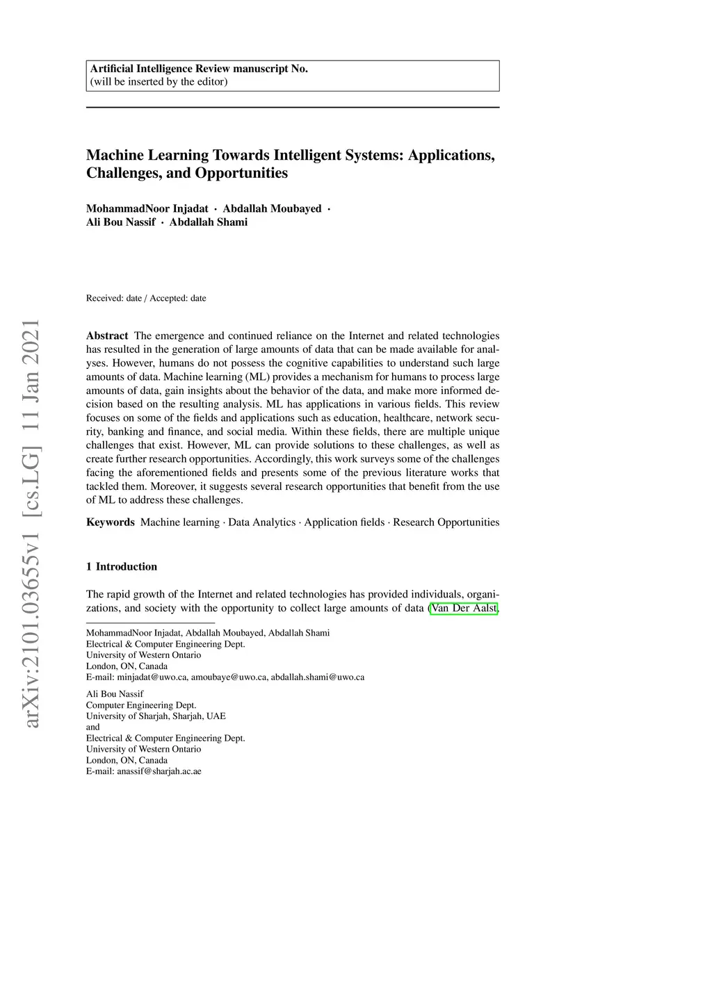 Machine Learning Towards Intelligent Systems: Applications, Challenges,