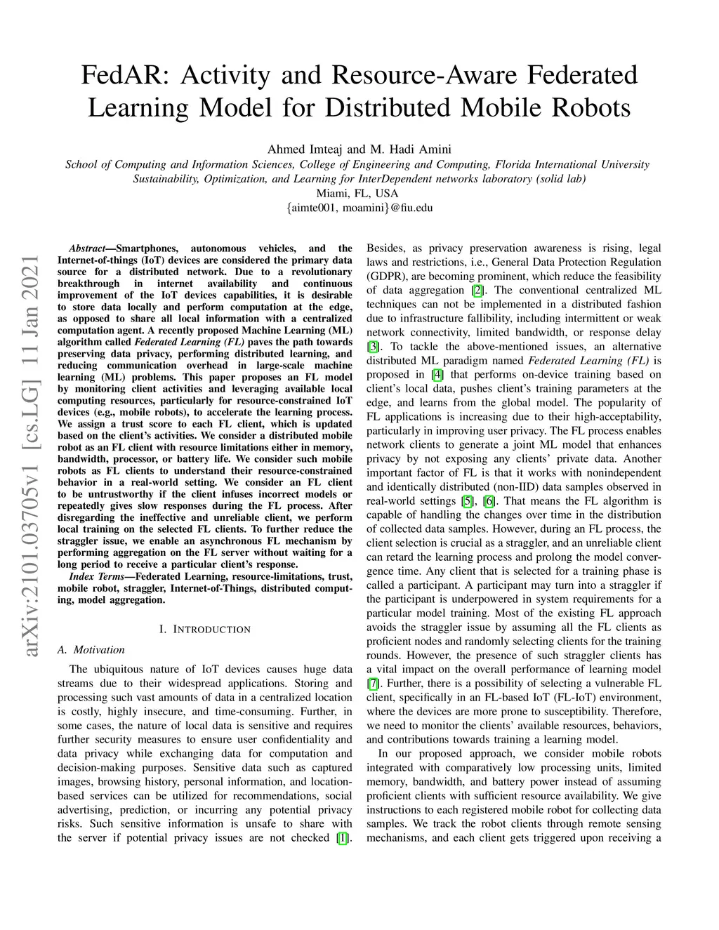 Smartphones, autonomous vehicles, and the Internet-of-things (IoT) devices are considered the primary data source for a distributed network. Due to a revolutionary breakthrough in internet availability and continuous improvement of the IoT devices capabilities, it is desirable to store data locally and perform computation at the edge, as opposed to share all local information with a centralized computation agent. A recently proposed Machine Learning (ML) algorithm called Federated Learning (FL) paves the path towards preserving data privacy, performing distributed learning, and reducing communication overhead in large-scale machine learning (ML) problems. This paper proposes an FL model by monitoring client activities and leveraging available local computing resources, particularly for resource-constrained IoT devices (e.g., mobile robots), to accelerate the learning process. We assign a trust score to each FL client, which is updated based on the client's activities. We consider a distributed mobile robot as an FL client with resource limitations either in memory, bandwidth, processor, or battery life. We consider such mobile robots as FL clients to understand their resource-constrained behavior in a real-world setting. We consider an FL client to be untrustworthy if the client infuses incorrect models or repeatedly gives slow responses during the FL process. After disregarding the ineffective and unreliable client, we perform local training on the selected FL clients. To further reduce the straggler issue, we enable an asynchronous FL mechanism by performing aggregation on the FL server without waiting for a long period to receive a particular client's response.