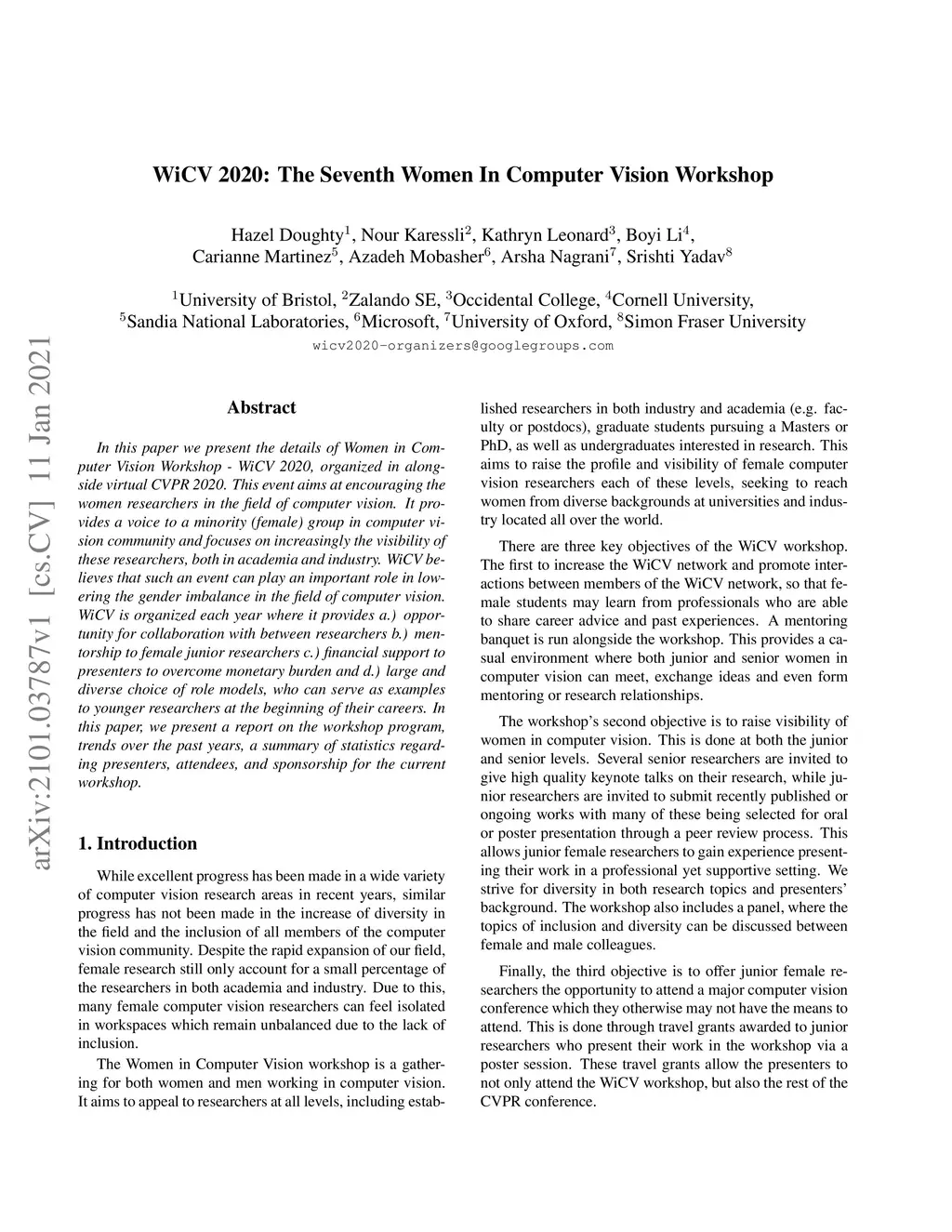 In this paper we present the details of Women in Computer Vision Workshop - WiCV 2020, organized in alongside virtual CVPR 2020. This event aims at encouraging the women researchers in the field of computer vision. It provides a voice to a minority (female) group in computer vision community and focuses on increasingly the visibility of these researchers, both in academia and industry. WiCV believes that such an event can play an important role in lowering the gender imbalance in the field of computer vision. WiCV is organized each year where it provides a.) opportunity for collaboration with between researchers b.) mentorship to female junior researchers c.) financial support to presenters to overcome monetary burden and d.) large and diverse choice of role models, who can serve as examples to younger researchers at the beginning of their careers. In this paper, we present a report on the workshop program, trends over the past years, a summary of statistics regarding presenters, attendees, and sponsorship for the current workshop.