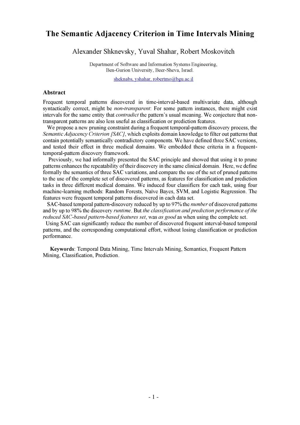 Frequent temporal patterns discovered in time-interval-based multivariate data, although syntactically correct, might be non-transparent: For some pattern instances, there might exist intervals for the same entity that contradict the pattern's usual meaning. We conjecture that non-transparent patterns are also less useful as classification or prediction features. We propose a new pruning constraint during a frequent temporal-pattern discovery process, the Semantic Adjacency Criterion [SAC], which exploits domain knowledge to filter out patterns that contain potentially semantically contradictory components. We have defined three SAC versions, and tested their effect in three medical domains. We embedded these criteria in a frequent-temporal-pattern discovery framework. Previously, we had informally presented the SAC principle and showed that using it to prune patterns enhances the repeatability of their discovery in the same clinical domain. Here, we define formally the semantics of three SAC variations, and compare the use of the set of pruned patterns to the use of the complete set of discovered patterns, as features for classification and prediction tasks in three different medical domains. We induced four classifiers for each task, using four machine-learning methods: Random Forests, Naive Bayes, SVM, and Logistic Regression. The features were frequent temporal patterns discovered in each data set. SAC-based temporal pattern-discovery reduced by up to 97% the number of discovered patterns and by up to 98% the discovery runtime. But the classification and prediction performance of the reduced SAC-based pattern-based features set, was as good as when using the complete set. Using SAC can significantly reduce the number of discovered frequent interval-based temporal patterns, and the corresponding computational effort, without losing classification or prediction performance.