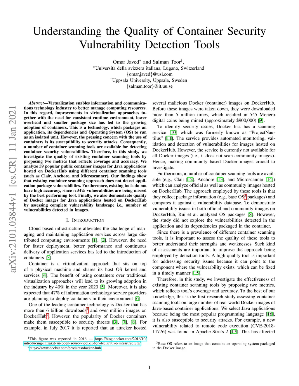Virtualization enables information and communications technology industry to better manage computing resources. In this regard, improvements in virtualization approaches together with the need for consistent runtime environment, lower overhead and smaller package size has led to the growing adoption of containers. This is a technology, which packages an application, its dependencies and Operating System (OS) to run as an isolated unit. However, the pressing concern with the use of containers is its susceptibility to security attacks. Consequently, a number of container scanning tools are available for detecting container security vulnerabilities. Therefore, in this study, we investigate the quality of existing container scanning tools by proposing two metrics that reflects coverage and accuracy. We analyze 59 popular public container images for Java applications hosted on DockerHub using different container scanning tools (such as Clair, Anchore, and Microscanner). Our findings show that existing container scanning approach does not detect application package vulnerabilities. Furthermore, existing tools do not have high accuracy, since 34% vulnerabilities are being missed by the best performing tool. Finally, we also demonstrate quality of Docker images for Java applications hosted on DockerHub by assessing complete vulnerability landscape i.e., number of vulnerabilities detected in images.