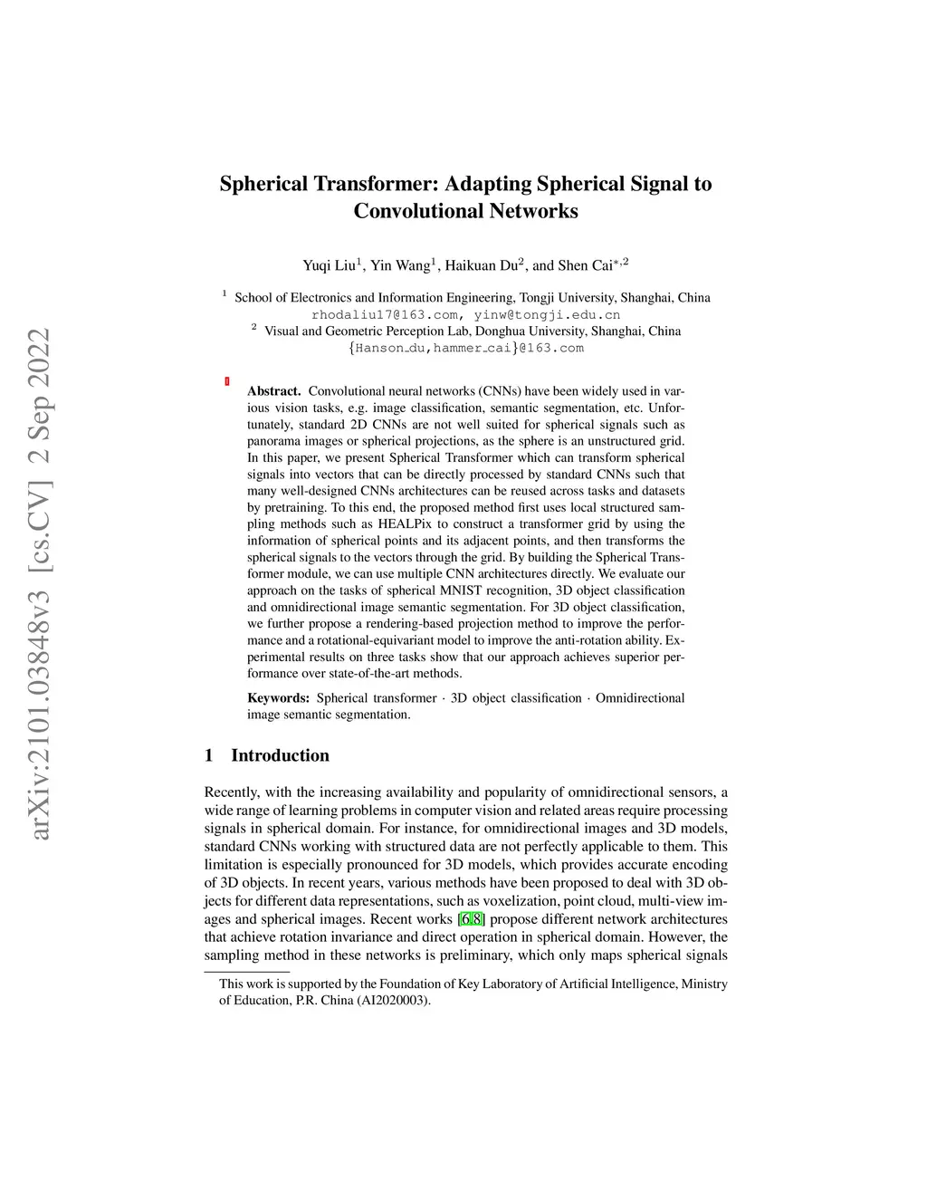 Convolutional neural networks (CNNs) have been widely used in various vision tasks, e.g. image classification, semantic segmentation, etc. Unfortunately, standard 2D CNNs are not well suited for spherical signals such as panorama images or spherical projections, as the sphere is an unstructured grid. In this paper, we present Spherical Transformer which can transform spherical signals into vectors that can be directly processed by standard CNNs such that many well-designed CNNs architectures can be reused across tasks and datasets by pretraining. To this end, the proposed method first uses local structured sampling methods such as HEALPix to construct a transformer grid by using the information of spherical points and its adjacent points, and then transforms the spherical signals to the vectors through the grid. By building the Spherical Transformer module, we can use multiple CNN architectures directly. We evaluate our approach on the tasks of spherical MNIST recognition, 3D object classification and omnidirectional image semantic segmentation. For 3D object classification, we further propose a rendering-based projection method to improve the performance and a rotational-equivariant model to improve the anti-rotation ability. Experimental results on three tasks show that our approach achieves superior performance over state-of-the-art methods.