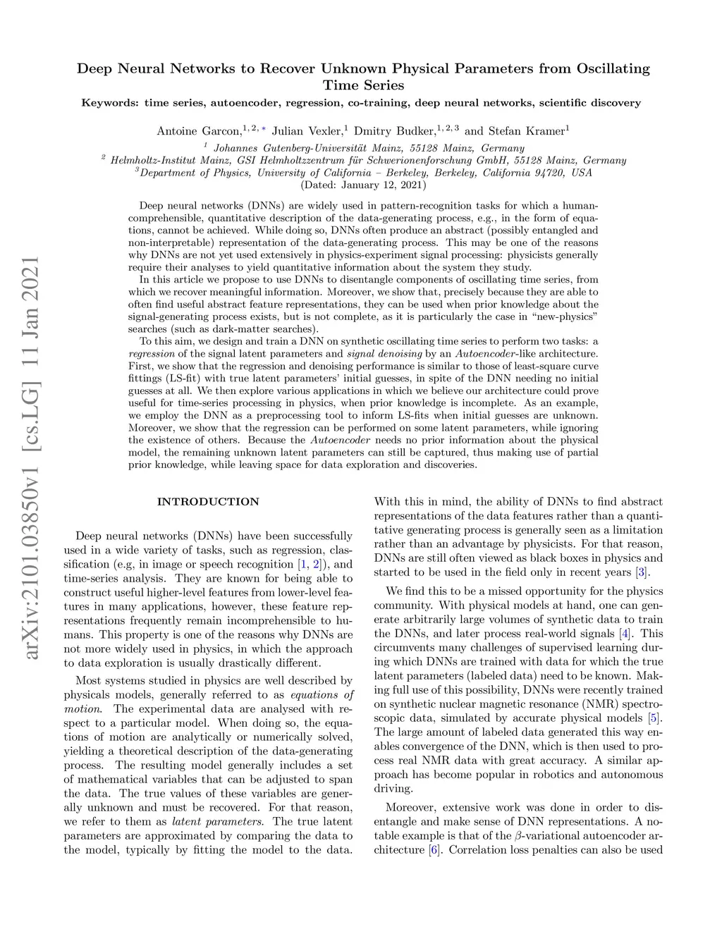 Deep neural networks (DNNs) are widely used in pattern-recognition tasks for which a human comprehensible, quantitative description of the data-generating process, e.g., in the form of equations, cannot be achieved. While doing so, DNNs often produce an abstract (entangled and non-interpretable) representation of the data-generating process. This is one of the reasons why DNNs are not extensively used in physics-signal processing: physicists generally require their analyses to yield quantitative information about the studied systems. In this article we use DNNs to disentangle components of oscillating time series, and recover meaningful information. We show that, because DNNs can find useful abstract feature representations, they can be used when prior knowledge about the signal-generating process exists, but is not complete, as it is particularly the case in "new-physics" searches. To this aim, we train our DNN on synthetic oscillating time series to perform two tasks: a regression of the signal latent parameters and signal denoising by an Autoencoder-like architecture. We show that the regression and denoising performance is similar to those of least-square curve fittings (LS-fit) with true latent parameters' initial guesses, in spite of the DNN needing no initial guesses at all. We then explore applications in which we believe our architecture could prove useful for time-series processing in physics, when prior knowledge is incomplete. As an example, we employ DNNs as a tool to inform LS-fits when initial guesses are unknown. We show that the regression can be performed on some latent parameters, while ignoring the existence of others. Because the Autoencoder needs no prior information about the physical model, the remaining unknown latent parameters can still be captured, thus making use of partial prior knowledge, while leaving space for data exploration and discoveries.