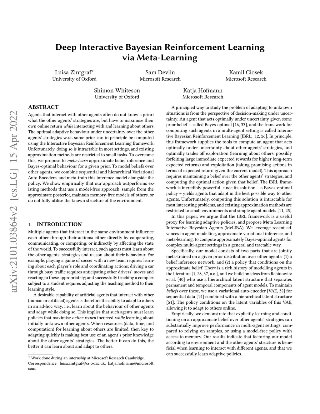 Agents that interact with other agents often do not know a priori what the other agents' strategies are, but have to maximise their own online return while interacting with and learning about others. The optimal adaptive behaviour under uncertainty over the other agents' strategies w.r.t. some prior can in principle be computed using the Interactive Bayesian Reinforcement Learning framework. Unfortunately, doing so is intractable in most settings, and existing approximation methods are restricted to small tasks. To overcome this, we propose to meta-learn approximate belief inference and Bayes-optimal behaviour for a given prior. To model beliefs over other agents, we combine sequential and hierarchical Variational Auto-Encoders, and meta-train this inference model alongside the policy. We show empirically that our approach outperforms existing methods that use a model-free approach, sample from the approximate posterior, maintain memory-free models of others, or do not fully utilise the known structure of the environment.