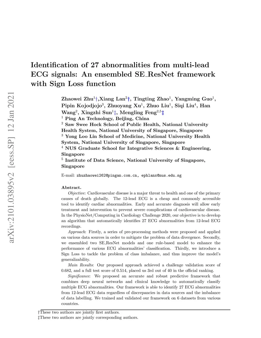 Cardiovascular disease is a major threat to health and one of the primary causes of death globally. The 12-lead ECG is a cheap and commonly accessible tool to identify cardiac abnormalities. Early and accurate diagnosis will allow early treatment and intervention to prevent severe complications of cardiovascular disease. In the PhysioNet/Computing in Cardiology Challenge 2020, our objective is to develop an algorithm that automatically identifies 27 ECG abnormalities from 12-lead ECG recordings.