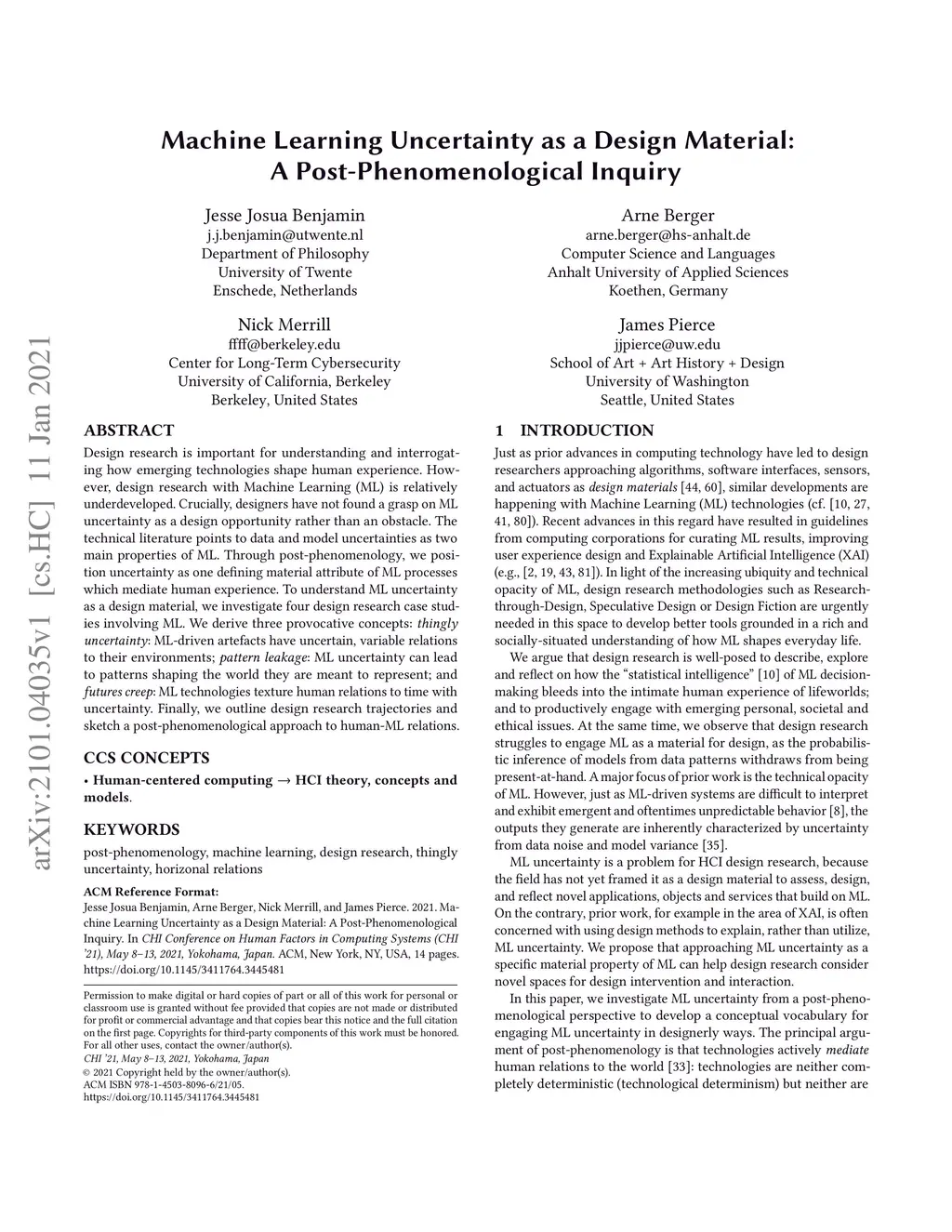 Design research is important for understanding and interrogating how emerging technologies shape human experience. However, design research with Machine Learning (ML) is relatively underdeveloped. Crucially, designers have not found a grasp on ML uncertainty as a design opportunity rather than an obstacle. The technical literature points to data and model uncertainties as two main properties of ML. Through post-phenomenology, we position uncertainty as one defining material attribute of ML processes which mediate human experience. To understand ML uncertainty as a design material, we investigate four design research case studies involving ML. We derive three provocative concepts: thingly uncertainty: ML-driven artefacts have uncertain, variable relations to their environments; pattern leakage: ML uncertainty can lead to patterns shaping the world they are meant to represent; and futures creep: ML technologies texture human relations to time with uncertainty. Finally, we outline design research trajectories and sketch a post-phenomenological approach to human-ML relations.