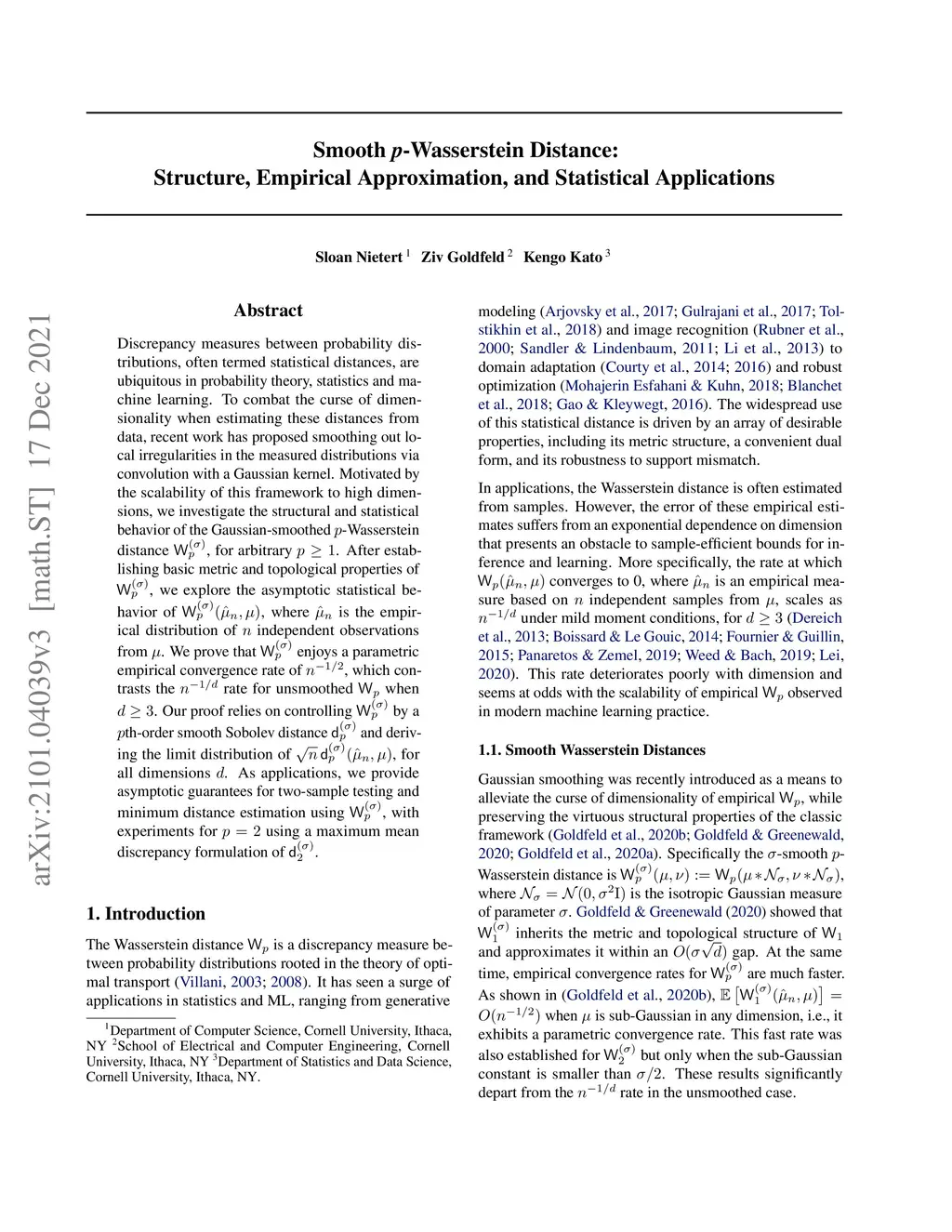 Discrepancy measures between probability distributions, often termed statistical distances, are ubiquitous in probability theory, statistics and machine learning. To combat the curse of dimensionality when estimating these distances from data, recent work has proposed smoothing out local irregularities in the measured distributions via convolution with a Gaussian kernel. Motivated by the scalability of this framework to high dimensions, we investigate the structural and statistical behavior of the Gaussian-smoothed -Wasserstein distance , for arbitrary . After establishing basic metric and topological properties of , we explore the asymptotic statistical behavior of , where is the empirical distribution of independent observations from . We prove that enjoys a parametric empirical convergence rate of , which contrasts the rate for unsmoothed when . Our proof relies on controlling by a th-order smooth Sobolev distance and deriving the limit distribution of , for all dimensions . As applications, we provide asymptotic guarantees for two-sample testing and minimum distance estimation using , with experiments for using a maximum mean discrepancy formulation of .