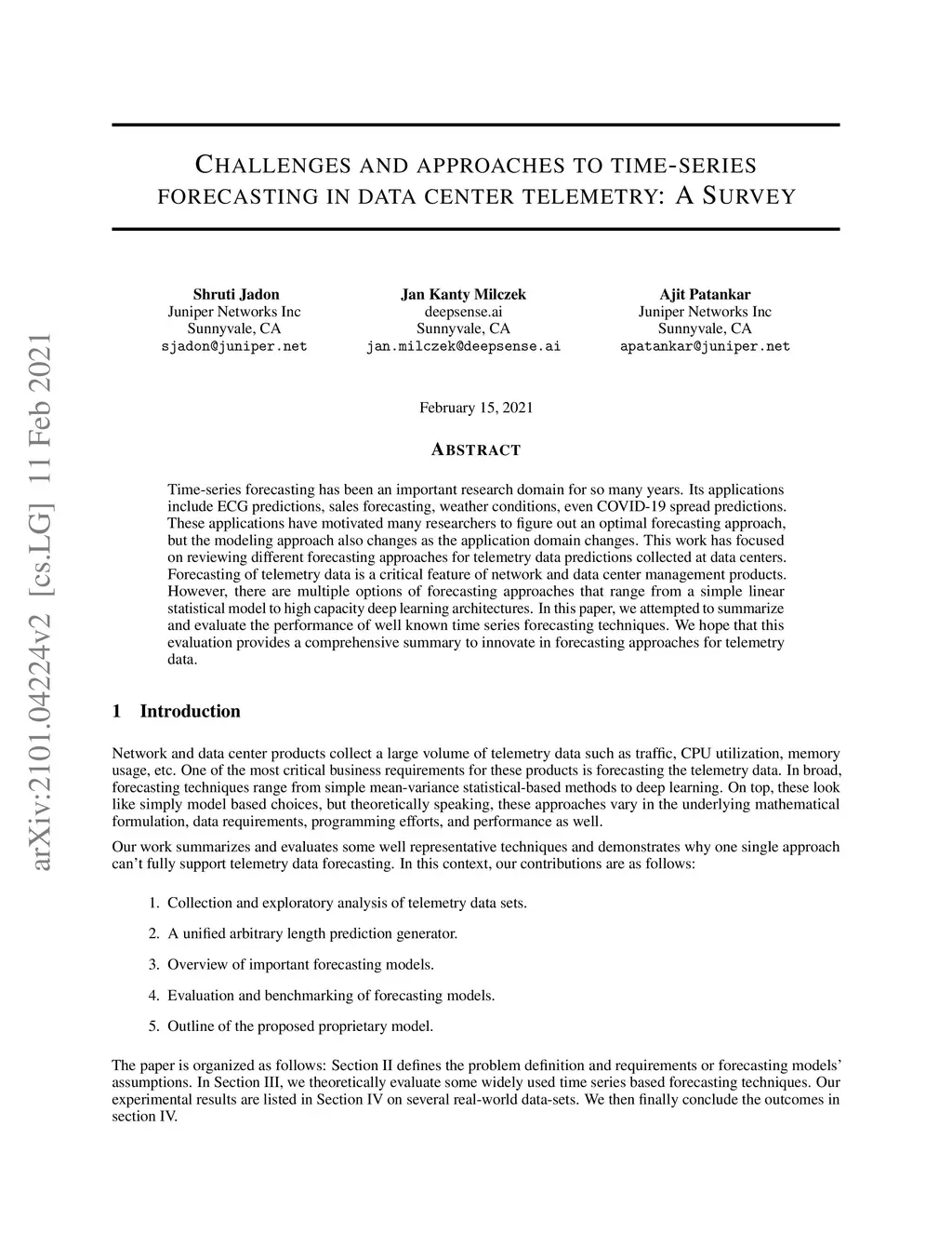 Time-series forecasting has been an important research domain for so many years. Its applications include ECG predictions, sales forecasting, weather conditions, even COVID-19 spread predictions. These applications have motivated many researchers to figure out an optimal forecasting approach, but the modeling approach also changes as the application domain changes. This work has focused on reviewing different forecasting approaches for telemetry data predictions collected at data centers. Forecasting of telemetry data is a critical feature of network and data center management products. However, there are multiple options of forecasting approaches that range from a simple linear statistical model to high capacity deep learning architectures. In this paper, we attempted to summarize and evaluate the performance of well known time series forecasting techniques. We hope that this evaluation provides a comprehensive summary to innovate in forecasting approaches for telemetry data.