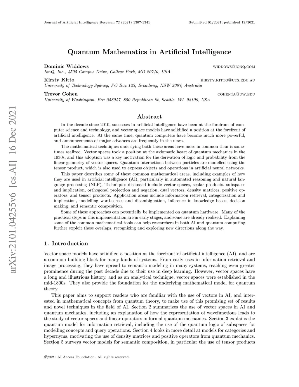 In the decade since 2010, successes in artificial intelligence have been at the forefront of computer science and technology, and vector space models have solidified a position at the forefront of artificial intelligence. At the same time, quantum computers have become much more powerful, and announcements of major advances are frequently in the news. The mathematical techniques underlying both these areas have more in common than is sometimes realized. Vector spaces took a position at the axiomatic heart of quantum mechanics in the 1930s, and this adoption was a key motivation for the derivation of logic and probability from the linear geometry of vector spaces. Quantum interactions between particles are modelled using the tensor product, which is also used to express objects and operations in artificial neural networks. This paper describes some of these common mathematical areas, including examples of how they are used in artificial intelligence (AI), particularly in automated reasoning and natural language processing (NLP). Techniques discussed include vector spaces, scalar products, subspaces and implication, orthogonal projection and negation, dual vectors, density matrices, positive operators, and tensor products. Application areas include information retrieval, categorization and implication, modelling word-senses and disambiguation, inference in knowledge bases, and semantic composition. Some of these approaches can potentially be implemented on quantum hardware. Many of the practical steps in this implementation are in early stages, and some are already realized. Explaining some of the common mathematical tools can help researchers in both AI and quantum computing further exploit these overlaps, recognizing and exploring new directions along the way.