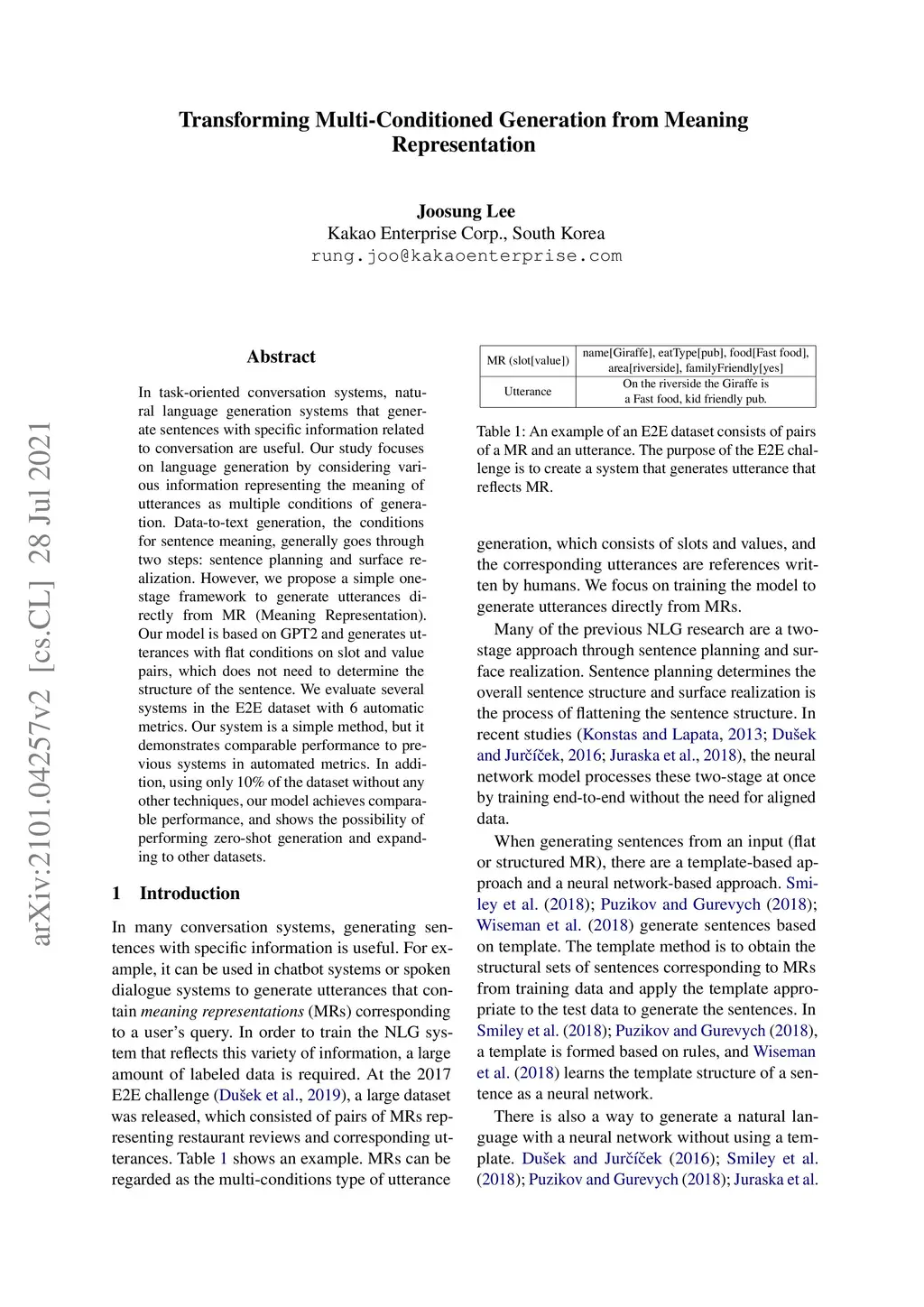 In task-oriented conversation systems, natural language generation systems that generate sentences with specific information related to conversation flow are useful. Our study focuses on language generation by considering various information representing the meaning of utterances as multiple conditions of generation. NLG from meaning representations, the conditions for sentence meaning, generally goes through two steps: sentence planning and surface realization. However, we propose a simple one-stage framework to generate utterances directly from MR (Meaning Representation). Our model is based on GPT2 and generates utterances with flat conditions on slot and value pairs, which does not need to determine the structure of the sentence. We evaluate several systems in the E2E dataset with 6 automatic metrics. Our system is a simple method, but it demonstrates comparable performance to previous systems in automated metrics. In addition, using only 10\% of the data set without any other techniques, our model achieves comparable performance, and shows the possibility of performing zero-shot generation and expanding to other datasets.