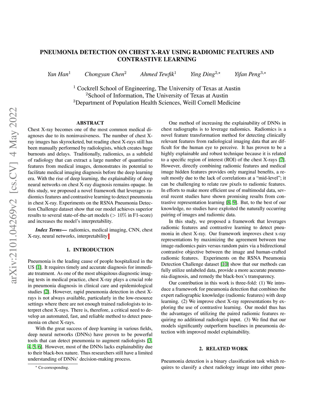 Chest X-ray becomes one of the most common medical diagnoses due to its noninvasiveness. The number of chest X-ray images has skyrocketed, but reading chest X-rays still have been manually performed by radiologists, which creates huge burnouts and delays. Traditionally, radiomics, as a subfield of radiology that can extract a large number of quantitative features from medical images, demonstrates its potential to facilitate medical imaging diagnosis before the deep learning era. With the rise of deep learning, the explainability of deep neural networks on chest X-ray diagnosis remains opaque. In this study, we proposed a novel framework that leverages radiomics features and contrastive learning to detect pneumonia in chest X-ray. Experiments on the RSNA Pneumonia Detection Challenge dataset show that our model achieves superior results to several state-of-the-art models (> 10% in F1-score) and increases the model's interpretability.