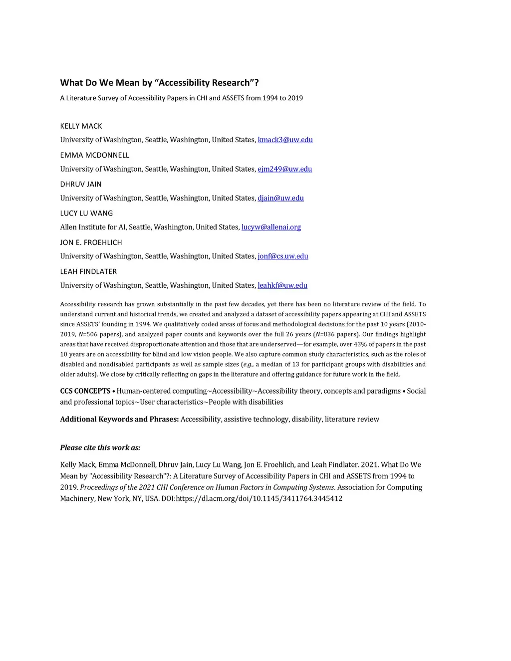 What Do We Mean by "Accessibility Research"? A Literature Survey of Accessibility Papers in CHI and ASSETS from 1994 to 2019