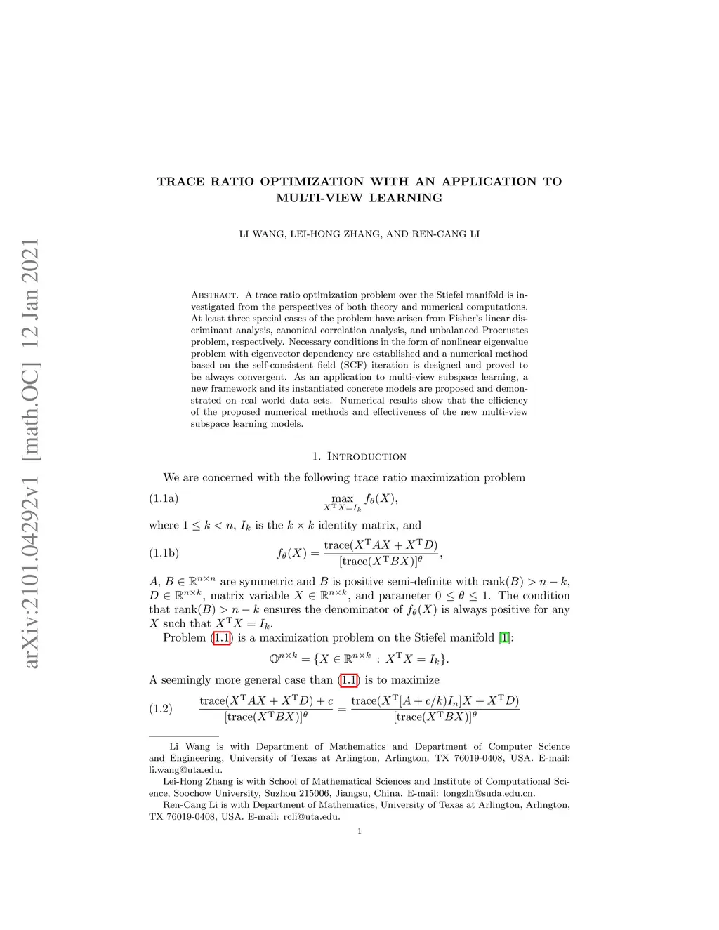 A trace ratio optimization problem over the Stiefel manifold is investigated from the perspectives of both theory and numerical computations. At least three special cases of the problem have arisen from Fisher linear discriminant analysis, canonical correlation analysis, and unbalanced Procrustes problem, respectively. Necessary conditions in the form of nonlinear eigenvalue problem with eigenvector dependency are established and a numerical method based on the self-consistent field (SCF) iteration is designed and proved to be always convergent. As an application to multi-view subspace learning, a new framework and its instantiated concrete models are proposed and demonstrated on real world data sets. Numerical results show that the efficiency of the proposed numerical methods and effectiveness of the new multi-view subspace learning models.