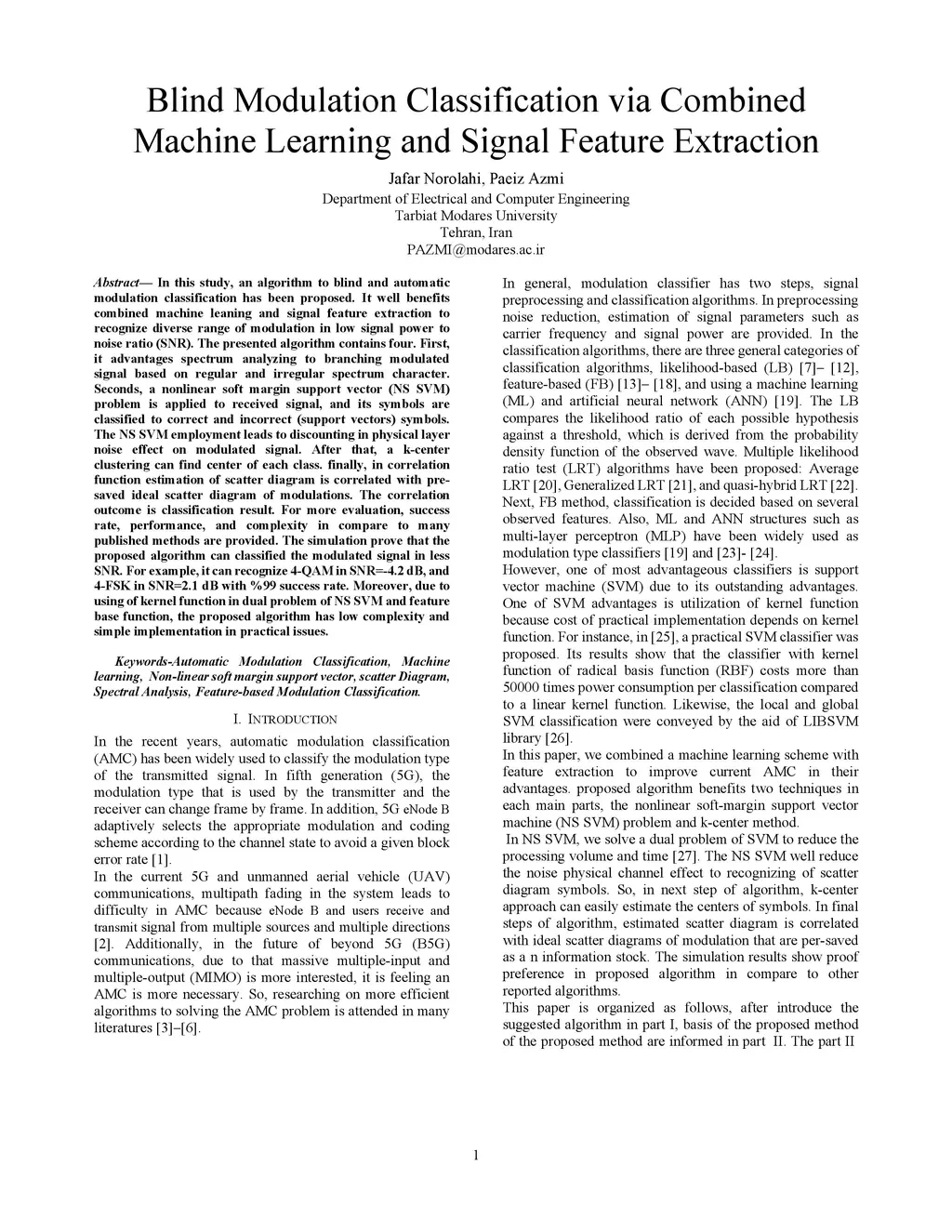 In this study, an algorithm to blind and automatic modulation classification has been proposed. It well benefits combined machine leaning and signal feature extraction to recognize diverse range of modulation in low signal power to noise ratio (SNR). The presented algorithm contains four. First, it advantages spectrum analyzing to branching modulated signal based on regular and irregular spectrum character. Seconds, a nonlinear soft margin support vector (NS SVM) problem is applied to received signal, and its symbols are classified to correct and incorrect (support vectors) symbols. The NS SVM employment leads to discounting in physical layer noise effect on modulated signal. After that, a k-center clustering can find center of each class. finally, in correlation function estimation of scatter diagram is correlated with pre-saved ideal scatter diagram of modulations. The correlation outcome is classification result. For more evaluation, success rate, performance, and complexity in compare to many published methods are provided. The simulation prove that the proposed algorithm can classified the modulated signal in less SNR. For example, it can recognize 4-QAM in SNR=-4.2 dB, and 4-FSK in SNR=2.1 dB with %99 success rate. Moreover, due to using of kernel function in dual problem of NS SVM and feature base function, the proposed algorithm has low complexity and simple implementation in practical issues.