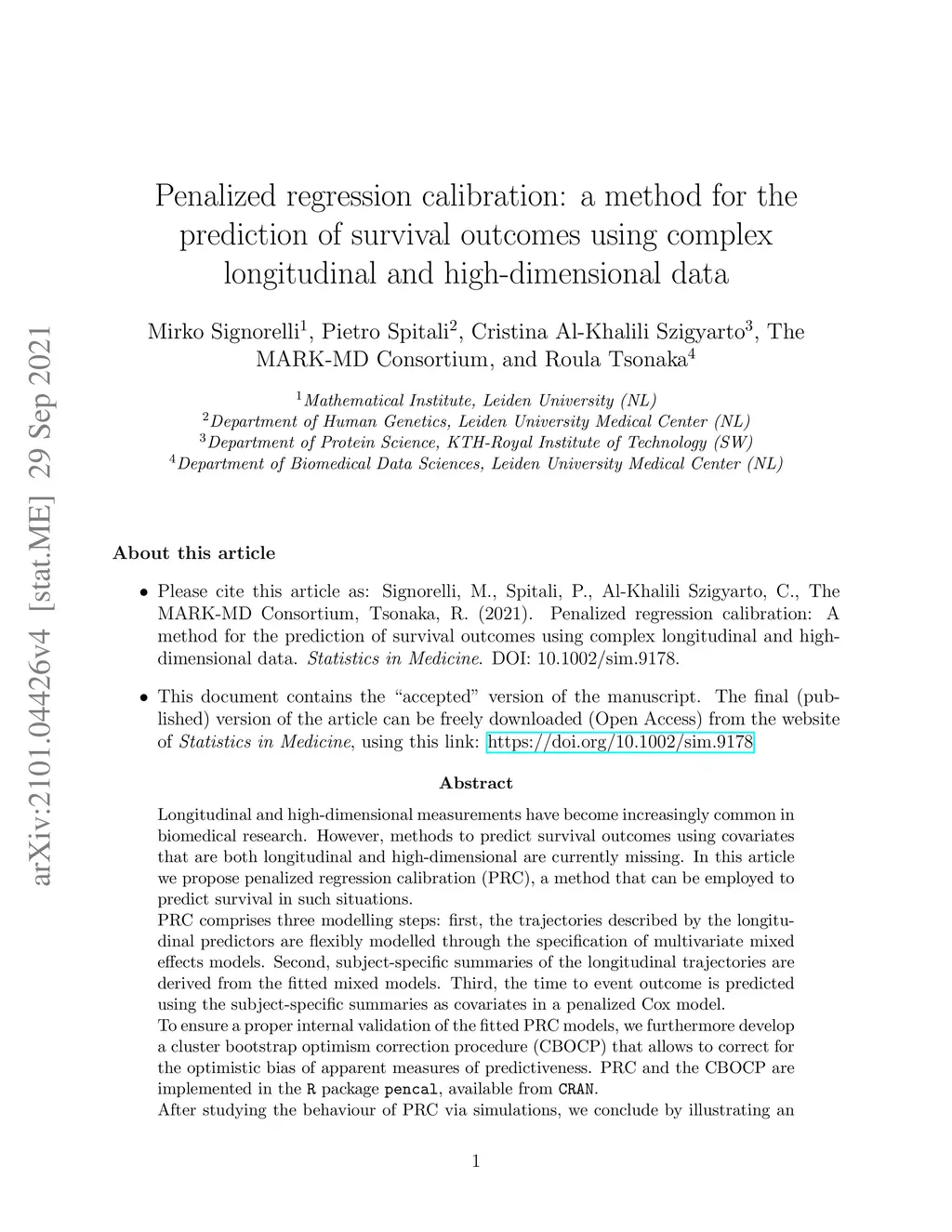 Longitudinal and high-dimensional measurements have become increasingly common in biomedical research. However, methods to predict survival outcomes using covariates that are both longitudinal and high-dimensional are currently missing. In this article, we propose penalized regression calibration (PRC), a method that can be employed to predict survival in such situations. PRC comprises three modeling steps: First, the trajectories described by the longitudinal predictors are flexibly modeled through the specification of multivariate mixed effects models. Second, subject-specific summaries of the longitudinal trajectories are derived from the fitted mixed models. Third, the time to event outcome is predicted using the subject-specific summaries as covariates in a penalized Cox model. To ensure a proper internal validation of the fitted PRC models, we furthermore develop a cluster bootstrap optimism correction procedure that allows to correct for the optimistic bias of apparent measures of predictiveness. PRC and the CBOCP are implemented in the R package pencal, available from CRAN. After studying the behavior of PRC via simulations, we conclude by illustrating an application of PRC to data from an observational study that involved patients affected by Duchenne muscular dystrophy, where the goal is predict time to loss of ambulation using longitudinal blood biomarkers.