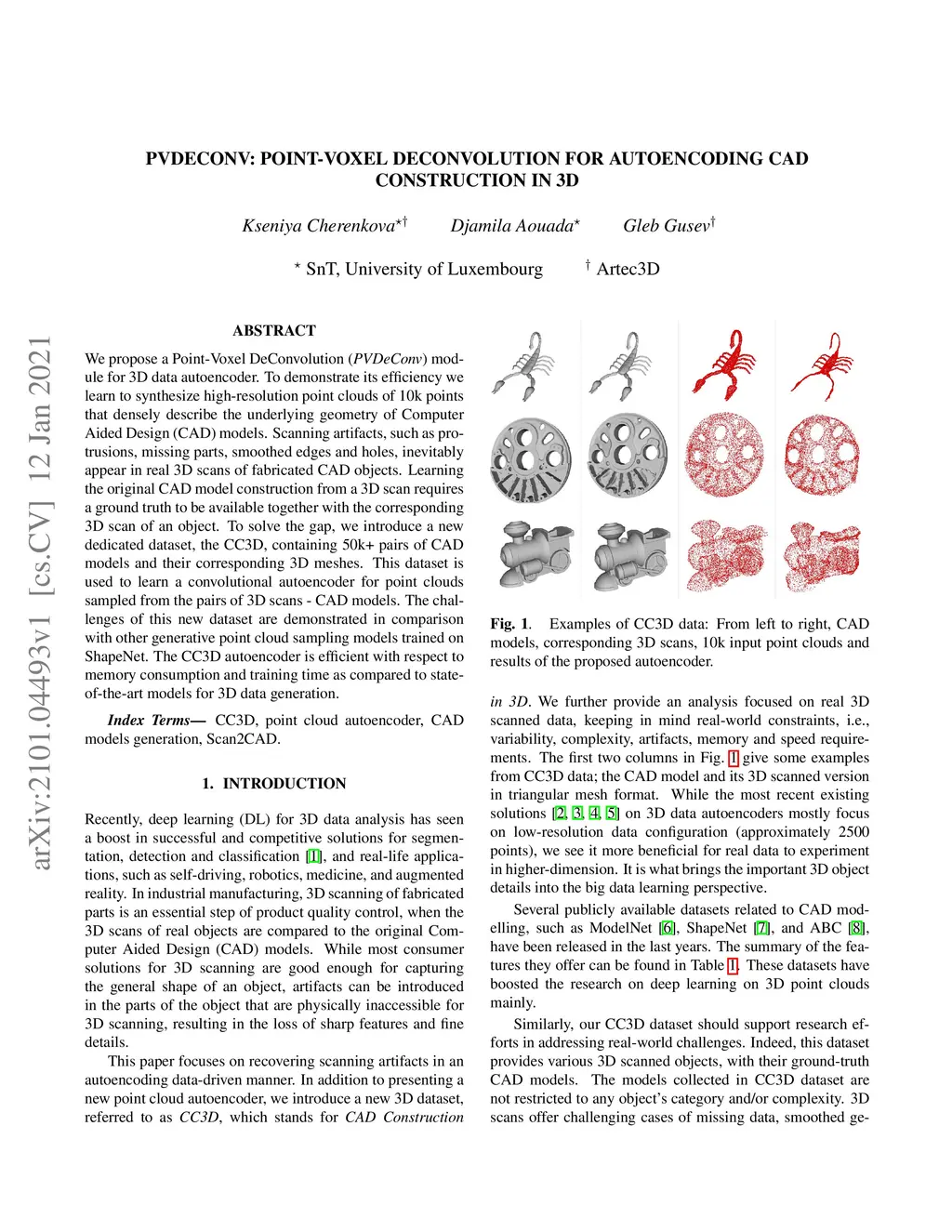 We propose a Point-Voxel DeConvolution (PVDeConv) module for 3D data autoencoder. To demonstrate its efficiency we learn to synthesize high-resolution point clouds of 10k points that densely describe the underlying geometry of Computer Aided Design (CAD) models. Scanning artifacts, such as protrusions, missing parts, smoothed edges and holes, inevitably appear in real 3D scans of fabricated CAD objects. Learning the original CAD model construction from a 3D scan requires a ground truth to be available together with the corresponding 3D scan of an object. To solve the gap, we introduce a new dedicated dataset, the CC3D, containing 50k+ pairs of CAD models and their corresponding 3D meshes. This dataset is used to learn a convolutional autoencoder for point clouds sampled from the pairs of 3D scans - CAD models. The challenges of this new dataset are demonstrated in comparison with other generative point cloud sampling models trained on ShapeNet. The CC3D autoencoder is efficient with respect to memory consumption and training time as compared to stateof-the-art models for 3D data generation.