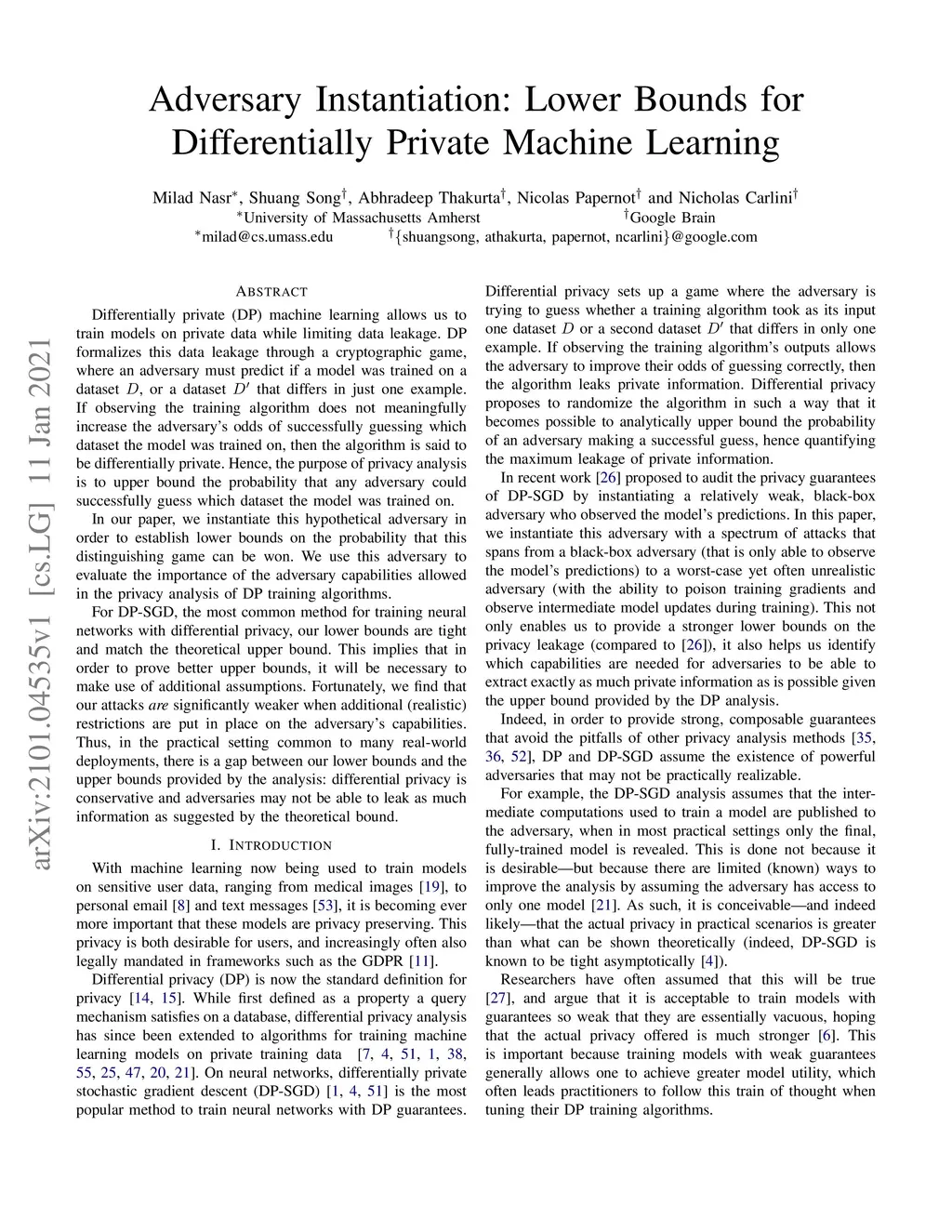 Differentially private (DP) machine learning allows us to train models on private data while limiting data leakage. DP formalizes this data leakage through a cryptographic game, where an adversary must predict if a model was trained on a dataset D, or a dataset D' that differs in just one example.If observing the training algorithm does not meaningfully increase the adversary's odds of successfully guessing which dataset the model was trained on, then the algorithm is said to be differentially private. Hence, the purpose of privacy analysis is to upper bound the probability that any adversary could successfully guess which dataset the model was trained on.In our paper, we instantiate this hypothetical adversary in order to establish lower bounds on the probability that this distinguishing game can be won. We use this adversary to evaluate the importance of the adversary capabilities allowed in the privacy analysis of DP training algorithms.For DP-SGD, the most common method for training neural networks with differential privacy, our lower bounds are tight and match the theoretical upper bound. This implies that in order to prove better upper bounds, it will be necessary to make use of additional assumptions. Fortunately, we find that our attacks are significantly weaker when additional (realistic)restrictions are put in place on the adversary's capabilities.Thus, in the practical setting common to many real-world deployments, there is a gap between our lower bounds and the upper bounds provided by the analysis: differential privacy is conservative and adversaries may not be able to leak as much information as suggested by the theoretical bound.