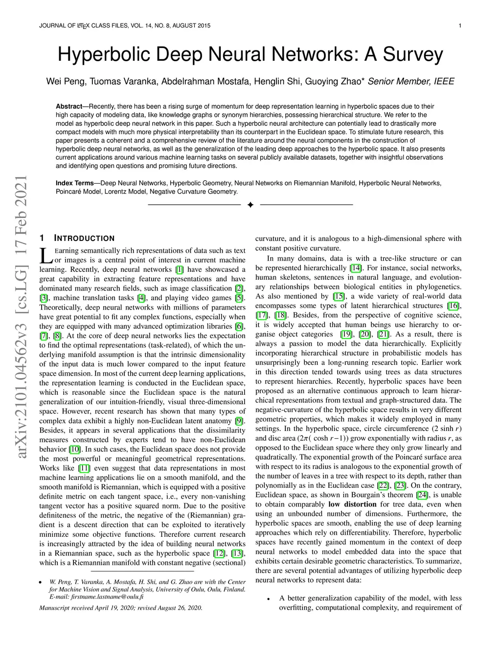 Recently, there has been a rising surge of momentum for deep representation learning in hyperbolic spaces due to theirhigh capacity of modeling data like knowledge graphs or synonym hierarchies, possessing hierarchical structure. We refer to the model as hyperbolic deep neural network in this paper. Such a hyperbolic neural architecture potentially leads to drastically compact model withmuch more physical interpretability than its counterpart in Euclidean space. To stimulate future research, this paper presents acoherent and comprehensive review of the literature around the neural components in the construction of hyperbolic deep neuralnetworks, as well as the generalization of the leading deep approaches to the Hyperbolic space. It also presents current applicationsaround various machine learning tasks on several publicly available datasets, together with insightful observations and identifying openquestions and promising future directions.
