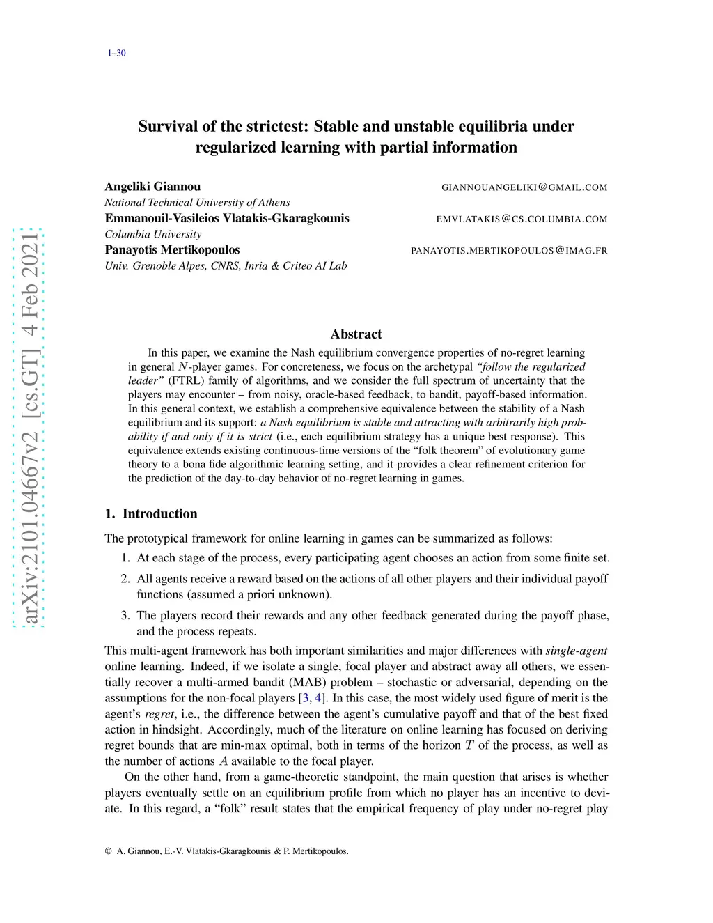In this paper, we examine the Nash equilibrium convergence properties of no-regret learning in general N-player games. For concreteness, we focus on the archetypal follow the regularized leader (FTRL) family of algorithms, and we consider the full spectrum of uncertainty that the players may encounter - from noisy, oracle-based feedback, to bandit, payoff-based information. In this general context, we establish a comprehensive equivalence between the stability of a Nash equilibrium and its support: a Nash equilibrium is stable and attracting with arbitrarily high probability if and only if it is strict (i.e., each equilibrium strategy has a unique best response). This equivalence extends existing continuous-time versions of the folk theorem of evolutionary game theory to a bona fide algorithmic learning setting, and it provides a clear refinement criterion for the prediction of the day-to-day behavior of no-regret learning in games