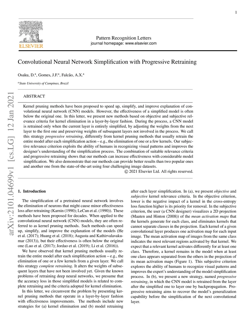 Kernel pruning methods have been proposed to speed up, simplify, and improve explanation of convolutional neural network (CNN) models. However, the effectiveness of a simplified model is often below the original one. In this letter, we present new methods based on objective and subjective relevance criteria for kernel elimination in a layer-by-layer fashion. During the process, a CNN model is retrained only when the current layer is entirely simplified, by adjusting the weights from the next layer to the first one and preserving weights of subsequent layers not involved in the process. We call this strategy \emph{progressive retraining}, differently from kernel pruning methods that usually retrain the entire model after each simplification action -- e.g., the elimination of one or a few kernels. Our subjective relevance criterion exploits the ability of humans in recognizing visual patterns and improves the designer's understanding of the simplification process. The combination of suitable relevance criteria and progressive retraining shows that our methods can increase effectiveness with considerable model simplification. We also demonstrate that our methods can provide better results than two popular ones and another one from the state-of-the-art using four challenging image datasets.