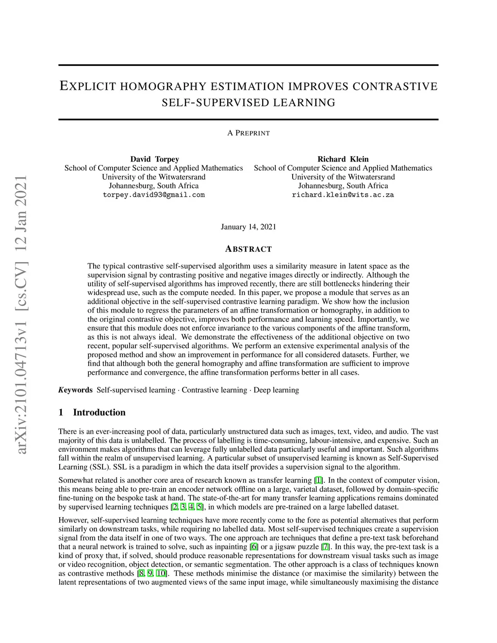 The typical contrastive self-supervised algorithm uses a similarity measure in latent space as the supervision signal by contrasting positive and negative images directly or indirectly. Although the utility of self-supervised algorithms has improved recently, there are still bottlenecks hindering their widespread use, such as the compute needed. In this paper, we propose a module that serves as an additional objective in the self-supervised contrastive learning paradigm. We show how the inclusion of this module to regress the parameters of an affine transformation or homography, in addition to the original contrastive objective, improves both performance and learning speed. Importantly, we ensure that this module does not enforce invariance to the various components of the affine transform, as this is not always ideal. We demonstrate the effectiveness of the additional objective on two recent, popular self-supervised algorithms. We perform an extensive experimental analysis of the proposed method and show an improvement in performance for all considered datasets. Further, we find that although both the general homography and affine transformation are sufficient to improve performance and convergence, the affine transformation performs better in all cases.