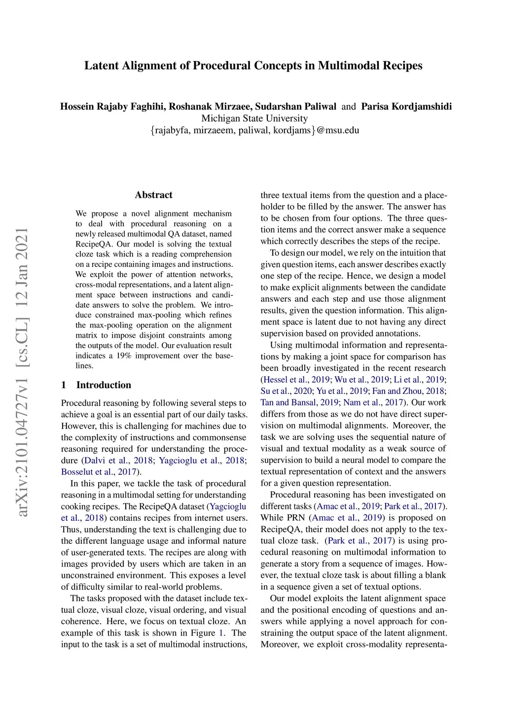 We propose a novel alignment mechanism to deal with procedural reasoning on a newly released multimodal QA dataset, named RecipeQA. Our model is solving the textual cloze task which is a reading comprehension on a recipe containing images and instructions. We exploit the power of attention networks, cross-modal representations, and a latent alignment space between instructions and candidate answers to solve the problem. We introduce constrained max-pooling which refines the max-pooling operation on the alignment matrix to impose disjoint constraints among the outputs of the model. Our evaluation result indicates a 19\% improvement over the baselines.