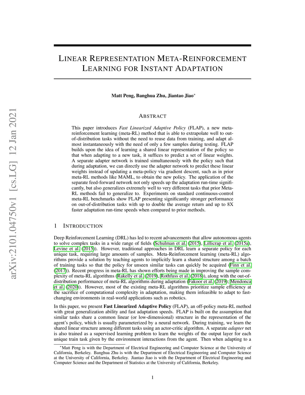 This paper introduces Fast Linearized Adaptive Policy (FLAP), a new meta-reinforcement learning (meta-RL) method that is able to extrapolate well to out-of-distribution tasks without the need to reuse data from training, and adapt almost instantaneously with the need of only a few samples during testing. FLAP builds upon the idea of learning a shared linear representation of the policy so that when adapting to a new task, it suffices to predict a set of linear weights. A separate adapter network is trained simultaneously with the policy such that during adaptation, we can directly use the adapter network to predict these linear weights instead of updating a meta-policy via gradient descent, such as in prior meta-RL methods like MAML, to obtain the new policy. The application of the separate feed-forward network not only speeds up the adaptation run-time significantly, but also generalizes extremely well to very different tasks that prior Meta-RL methods fail to generalize to. Experiments on standard continuous-control meta-RL benchmarks show FLAP presenting significantly stronger performance on out-of-distribution tasks with up to double the average return and up to 8X faster adaptation run-time speeds when compared to prior methods.