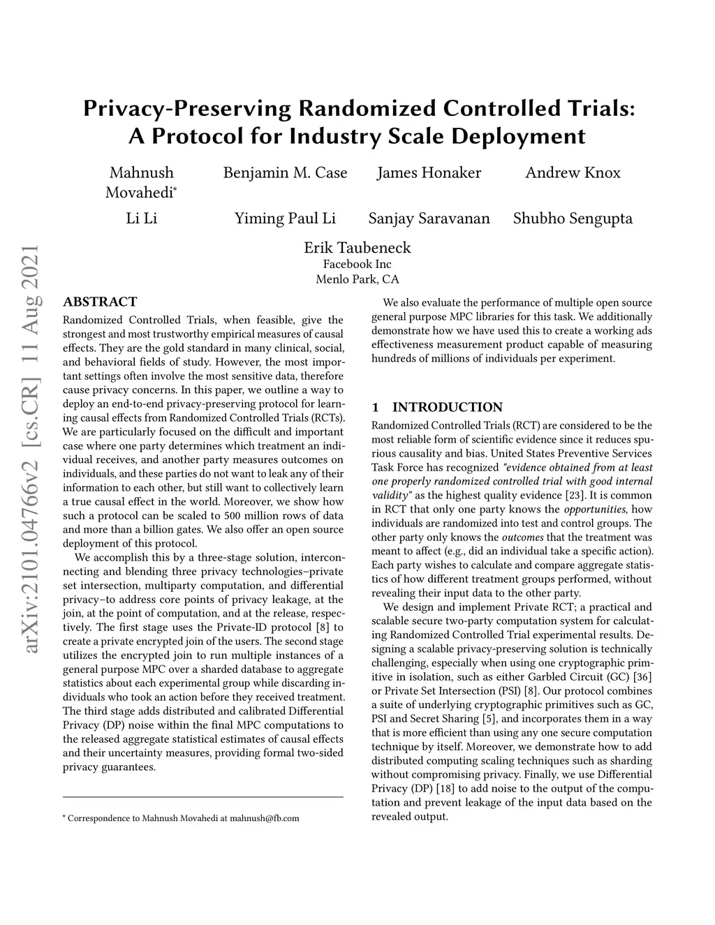 In this paper, we outline a way to deploy a privacy-preserving protocol for multiparty Randomized Controlled Trials on the scale of 500 million rows of data and more than a billion gates. Randomized Controlled Trials (RCTs) are widely used to improve business and policy decisions in various sectors such as healthcare, education, criminology, and marketing. A Randomized Controlled Trial is a scientifically rigorous method to measure the effectiveness of a treatment. This is accomplished by randomly allocating subjects to two or more groups, treating them differently, and then comparing the outcomes across groups. In many scenarios, multiple parties hold different parts of the data for conducting and analyzing RCTs. Given privacy requirements and expectations of each of these parties, it is often challenging to have a centralized store of data to conduct and analyze RCTs. We accomplish this by a three-stage solution. The first stage uses the Private Secret Share Set Intersection (PSI) solution to create a joined set and establish secret shares without revealing membership, while discarding individuals who were placed into more than one group. The second stage runs multiple instances of a general purpose MPC over a sharded database to aggregate statistics about each experimental group while discarding individuals who took an action before they received treatment. The third stage adds distributed and calibrated Differential Privacy (DP) noise to the aggregate statistics and uncertainty measures, providing formal two-sided privacy guarantees. We also evaluate the performance of multiple open source general purpose MPC libraries for this task. We additionally demonstrate how we have used this to create a working ads effectiveness measurement product capable of measuring hundreds of millions of individuals per experiment.