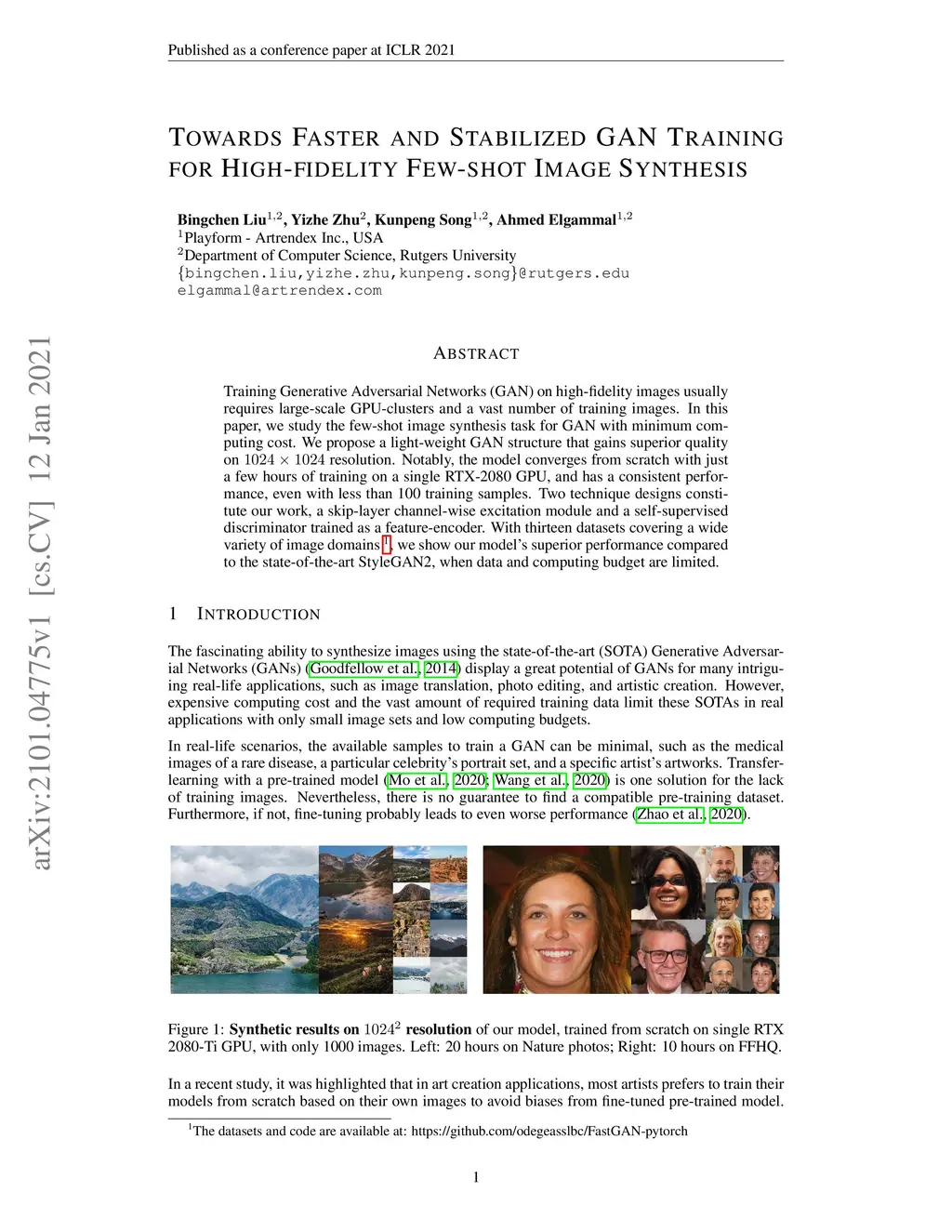 Training Generative Adversarial Networks (GAN) on high-fidelity images usually requires large-scale GPU-clusters and a vast number of training images. In this paper, we study the few-shot image synthesis task for GAN with minimum computing cost. We propose a light-weight GAN structure that gains superior quality on 1024*1024 resolution. Notably, the model converges from scratch with just a few hours of training on a single RTX-2080 GPU, and has a consistent performance, even with less than 100 training samples. Two technique designs constitute our work, a skip-layer channel-wise excitation module and a self-supervised discriminator trained as a feature-encoder. With thirteen datasets covering a wide variety of image domains (The datasets and code are available at: https://github.com/odegeasslbc/FastGAN-pytorch), we show our model's superior performance compared to the state-of-the-art StyleGAN2, when data and computing budget are limited.