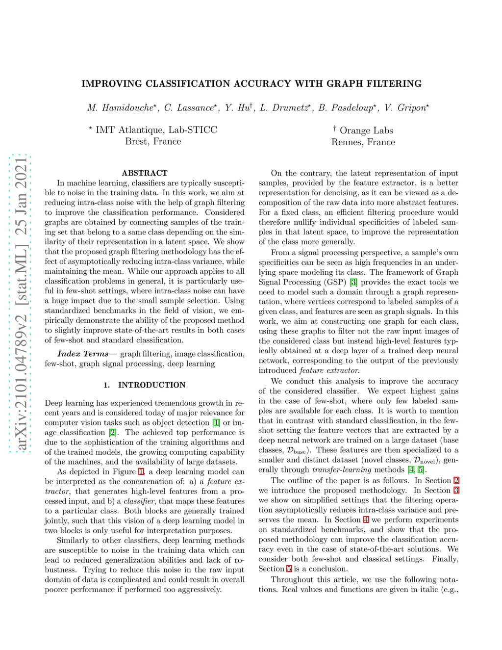In machine learning, classifiers are typically susceptible to noise in the training data. In this work, we aim at reducing intra-class noise with the help of graph filtering to improve the classification performance. Considered graphs are obtained by connecting samples of the training set that belong to a same class depending on the similarity of their representation in a latent space. We show that the proposed graph filtering methodology has the effect of asymptotically reducing intra-class variance, while maintaining the mean. While our approach applies to all classification problems in general, it is particularly useful in few-shot settings, where intra-class noise can have a huge impact due to the small sample selection. Using standardized benchmarks in the field of vision, we empirically demonstrate the ability of the proposed method to slightly improve state-of-the-art results in both cases of few-shot and standard classification.