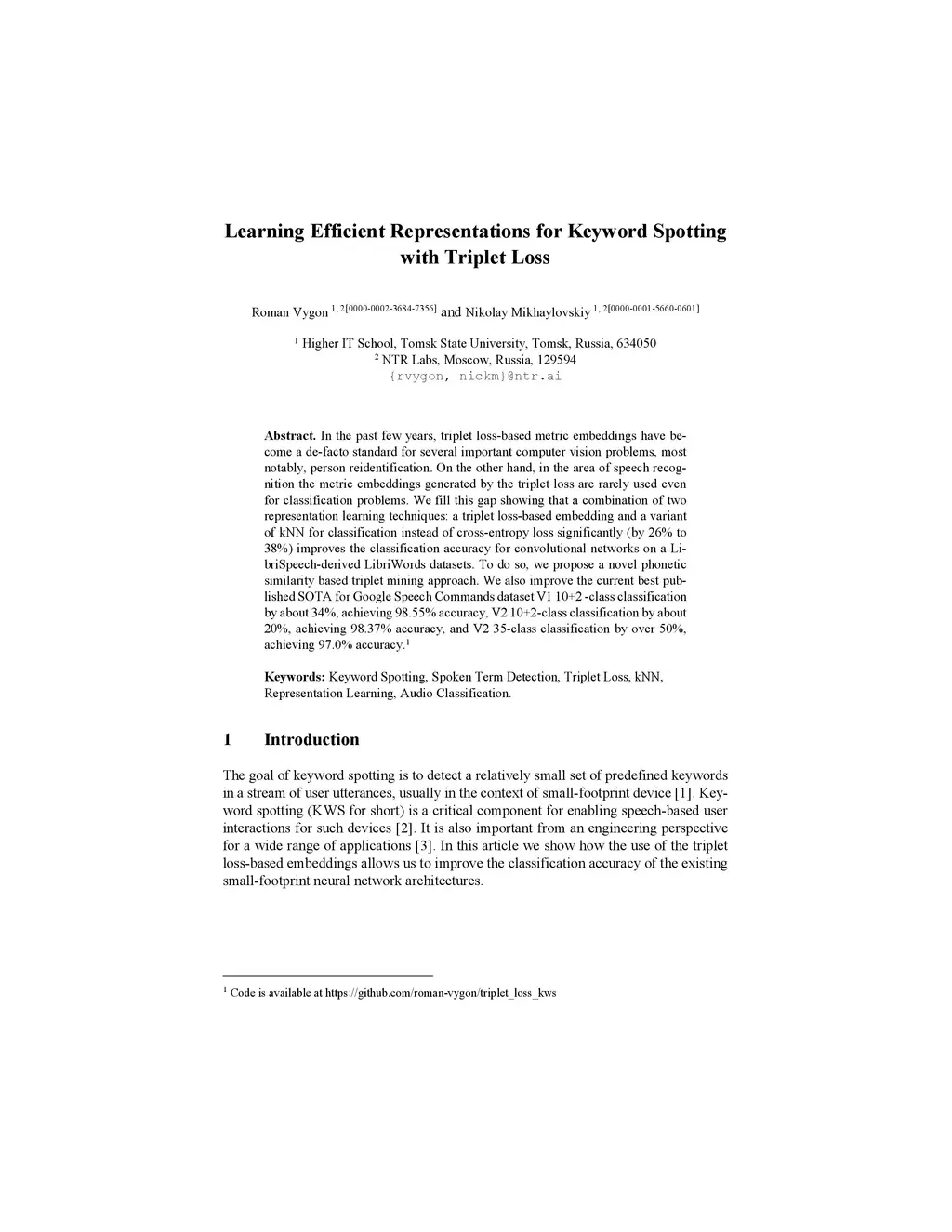 In the past few years, triplet loss-based metric embeddings have become a de-facto standard for several important computer vision problems, most no-tably, person reidentification. On the other hand, in the area of speech recognition the metric embeddings generated by the triplet loss are rarely used even for classification problems. We fill this gap showing that a combination of two representation learning techniques: a triplet loss-based embedding and a variant of kNN for classification instead of cross-entropy loss significantly (by 26% to 38%) improves the classification accuracy for convolutional networks on a LibriSpeech-derived LibriWords datasets. To do so, we propose a novel phonetic similarity based triplet mining approach. We also improve the current best published SOTA for Google Speech Commands dataset V1 10+2 -class classification by about 34%, achieving 98.55% accuracy, V2 10+2-class classification by about 20%, achieving 98.37% accuracy, and V2 35-class classification by over 50%, achieving 97.0% accuracy.