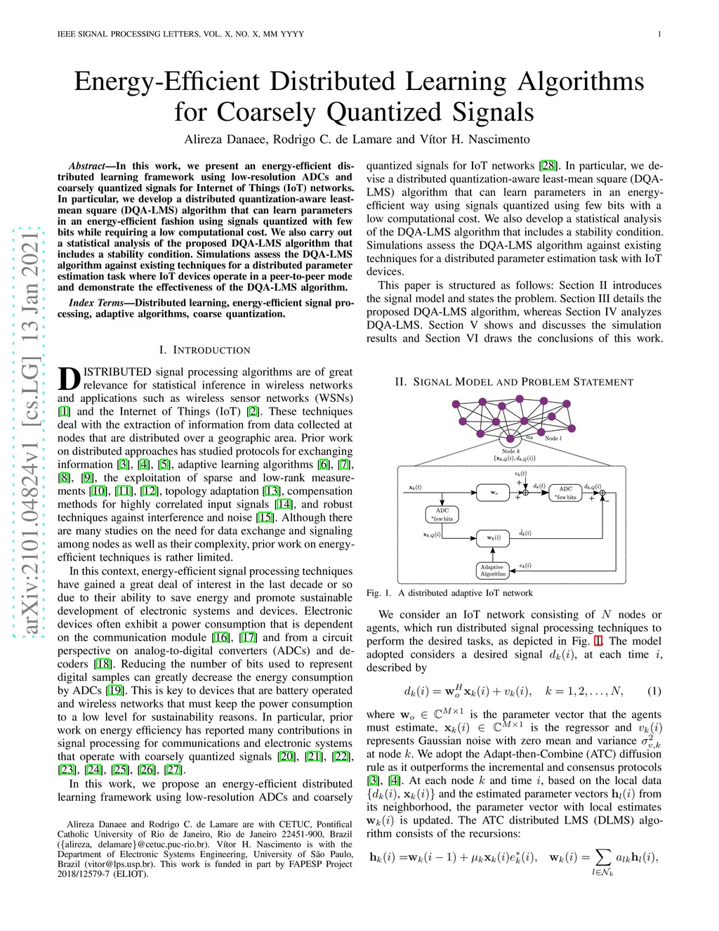 In this work, we present an energy-efficient distributed learning framework using low-resolution ADCs and coarsely quantized signals for Internet of Things (IoT) networks. In particular, we develop a distributed quantization-aware least-mean square (DQA-LMS) algorithm that can learn parameters in an energy-efficient fashion using signals quantized with few bits while requiring a low computational cost. We also carry out a statistical analysis of the proposed DQA-LMS algorithm that includes a stability condition. Simulations assess the DQA-LMS algorithm against existing techniques for a distributed parameter estimation task where IoT devices operate in a peer-to-peer mode and demonstrate the effectiveness of the DQA-LMS algorithm.